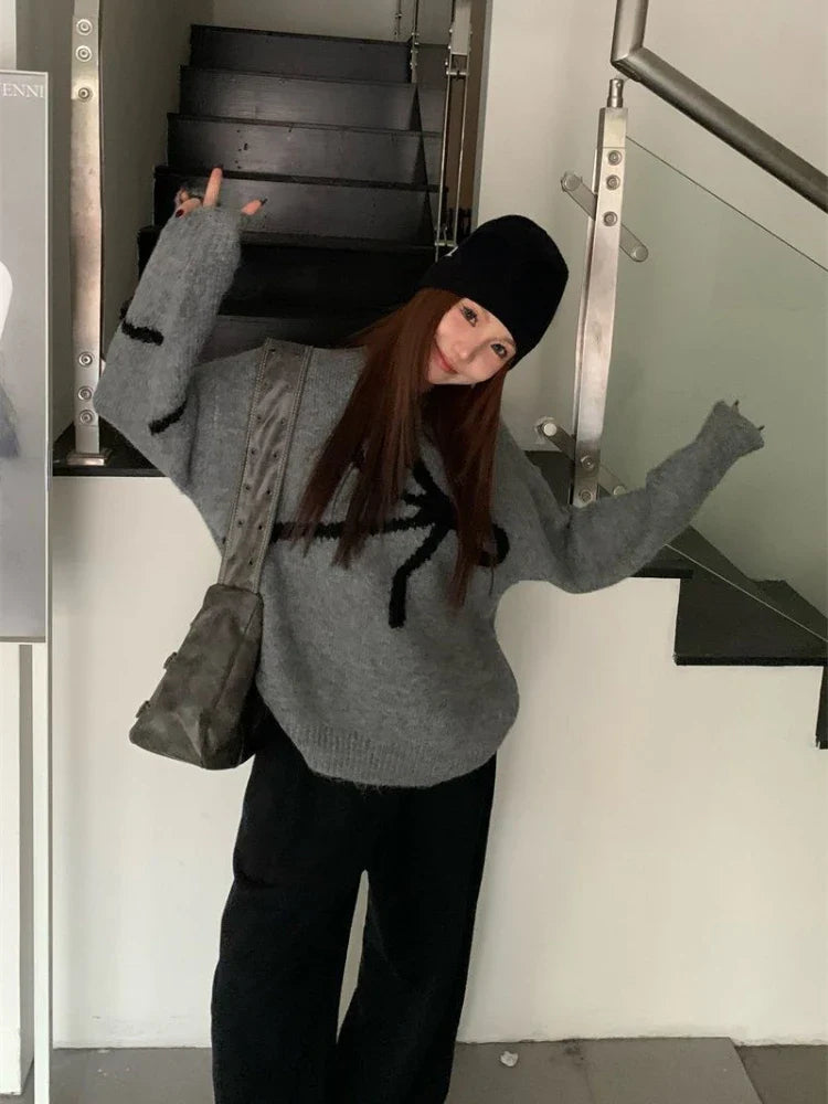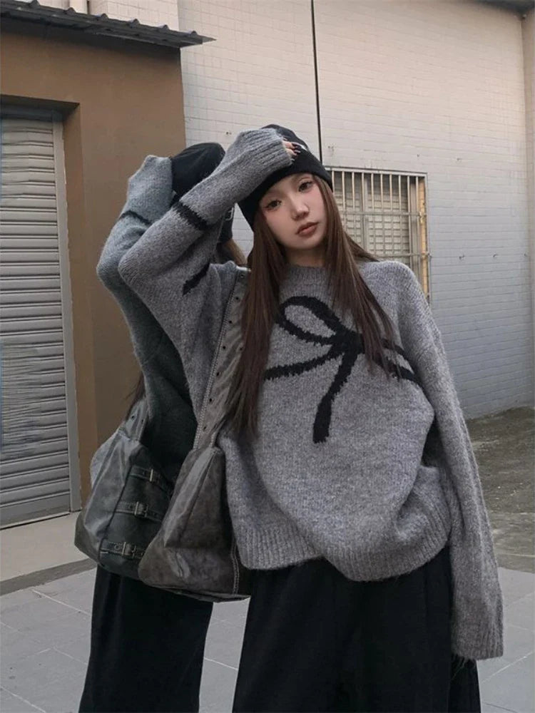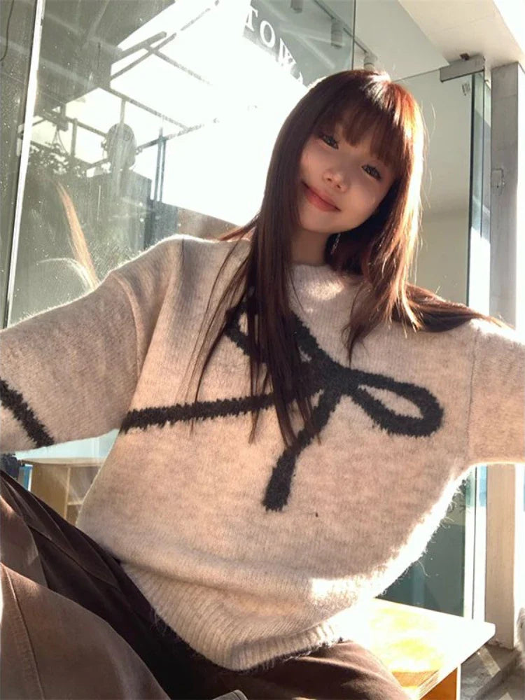 Znbbw Vintage Pullovers for Women Long Sleeve Bow Jacquard Autumn Winter Sweaters Design Aesthetics Loose All Match Clothing