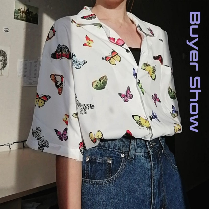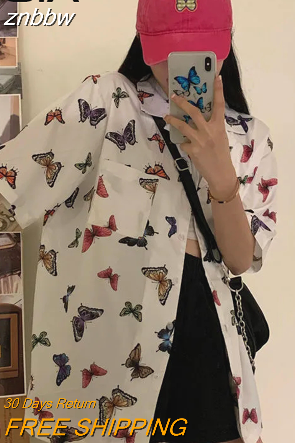 znbbw Vitage Short Sleeve Loose Women Blouse Shirt Y2K Butterfly Printing Button Up Pockets Womens Shirts 2023 Summer Felame Tops