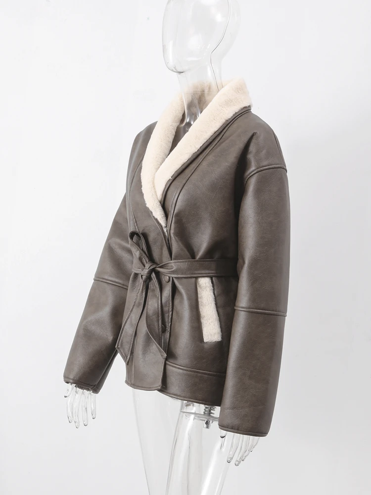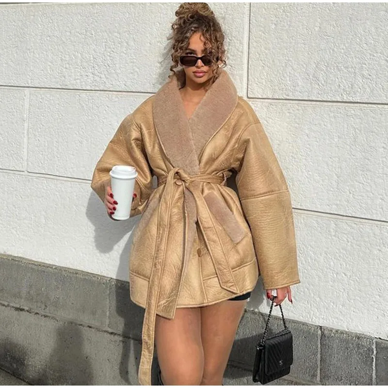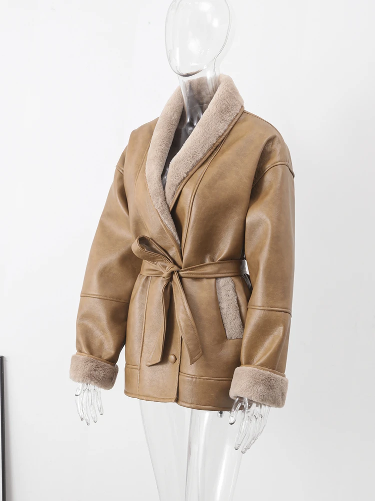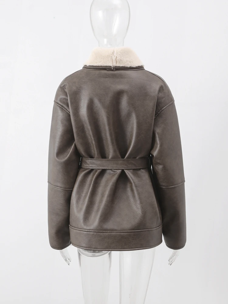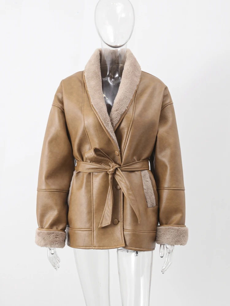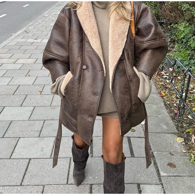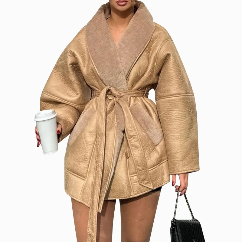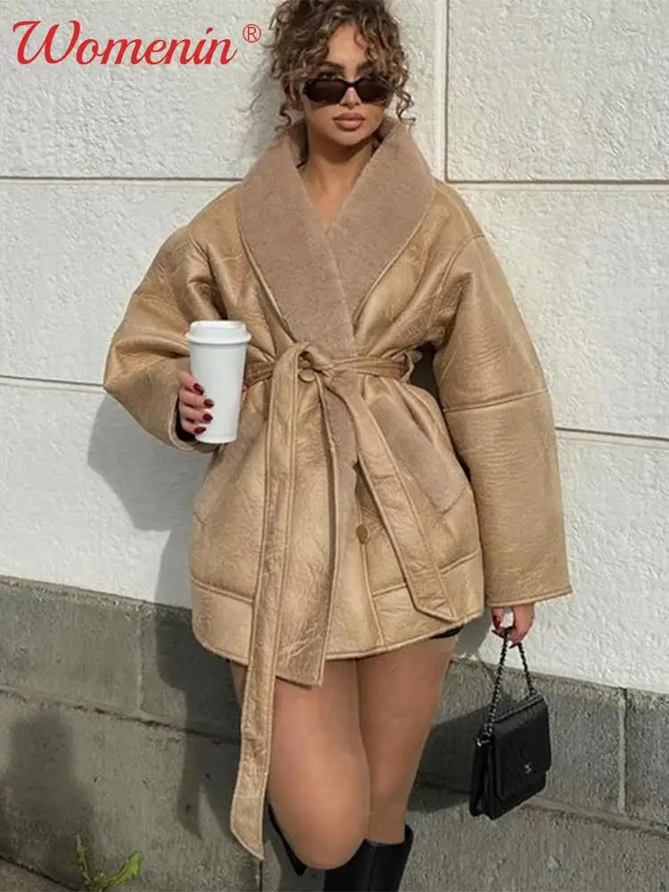 Znbbw Winter Leather Jacket Women 2024 New Female Vintage Lapel Faux Wool Belt Coat Thicken Warm Oversize Highstreet Outwear Top