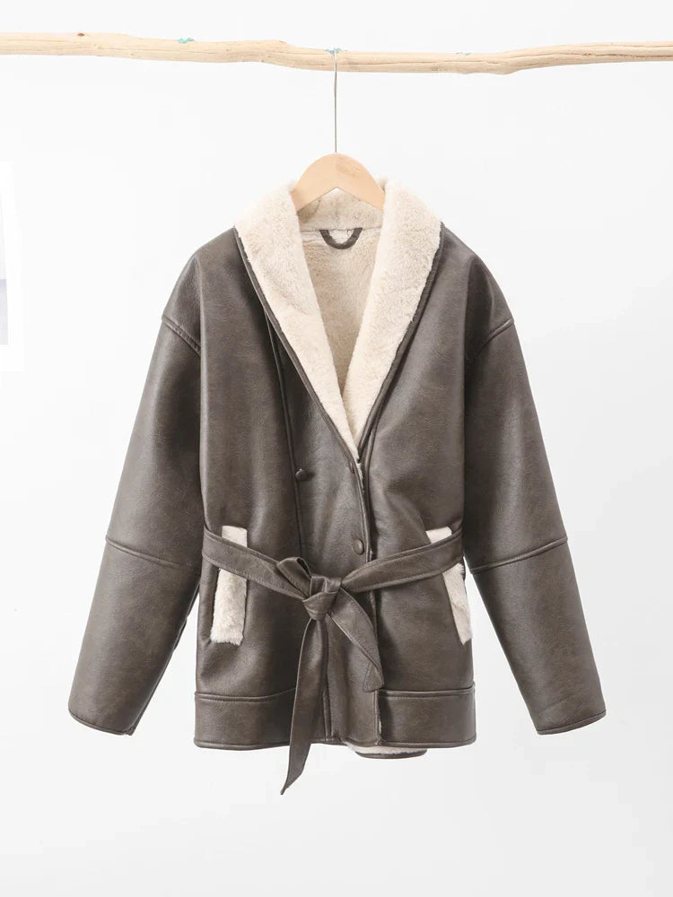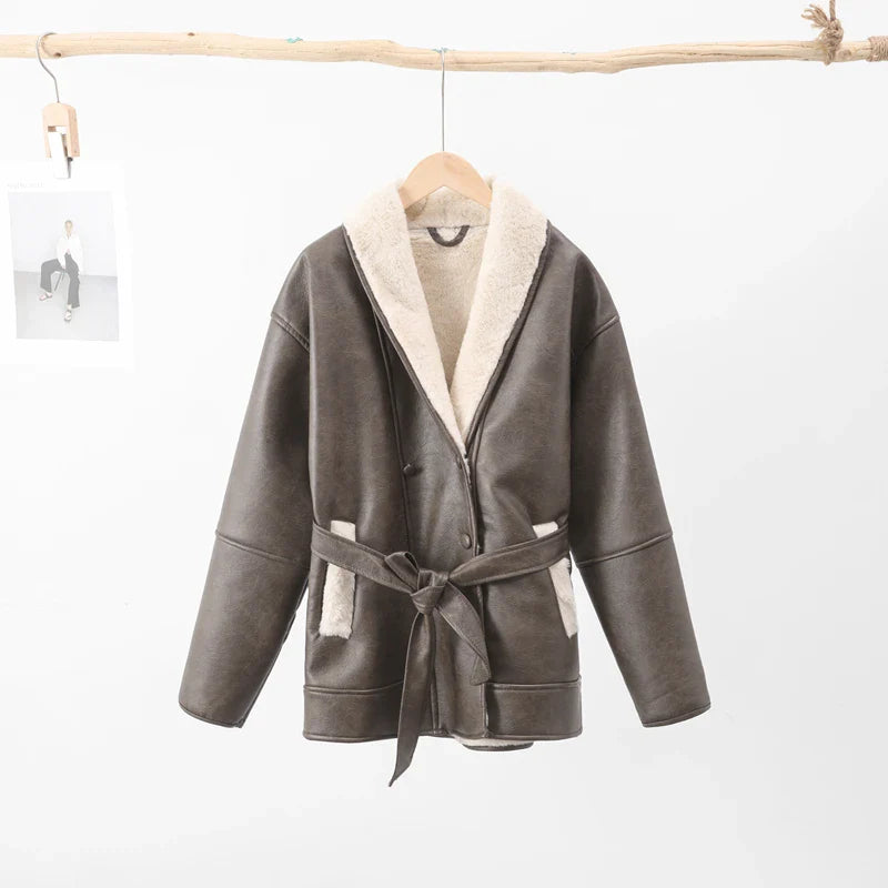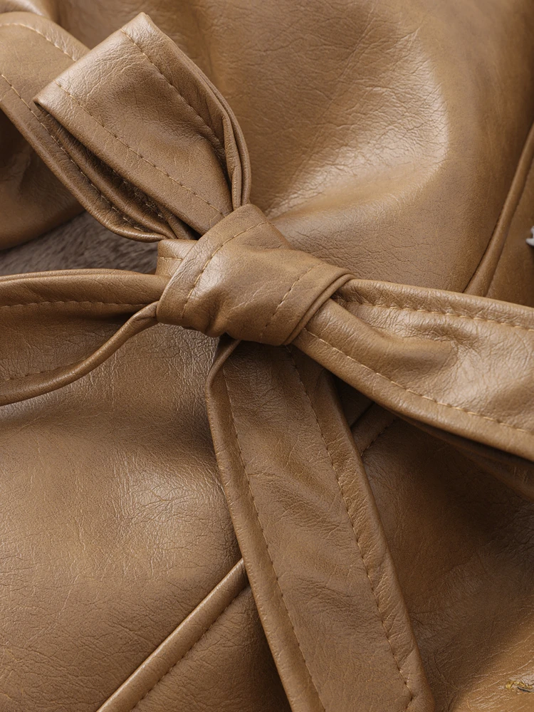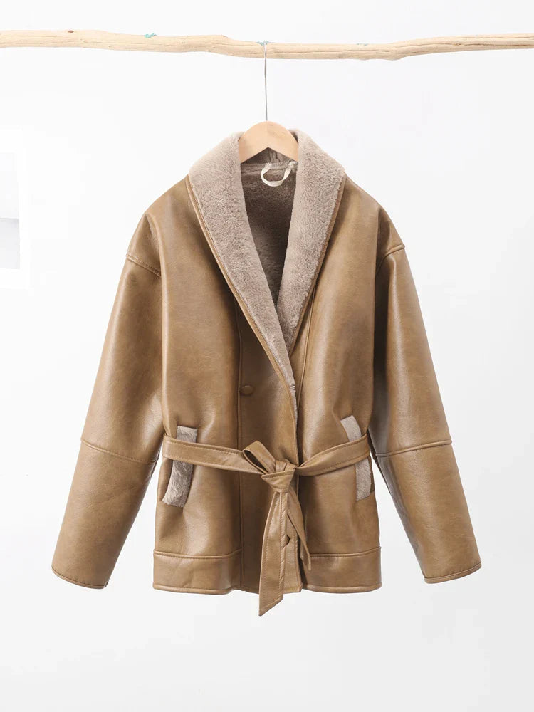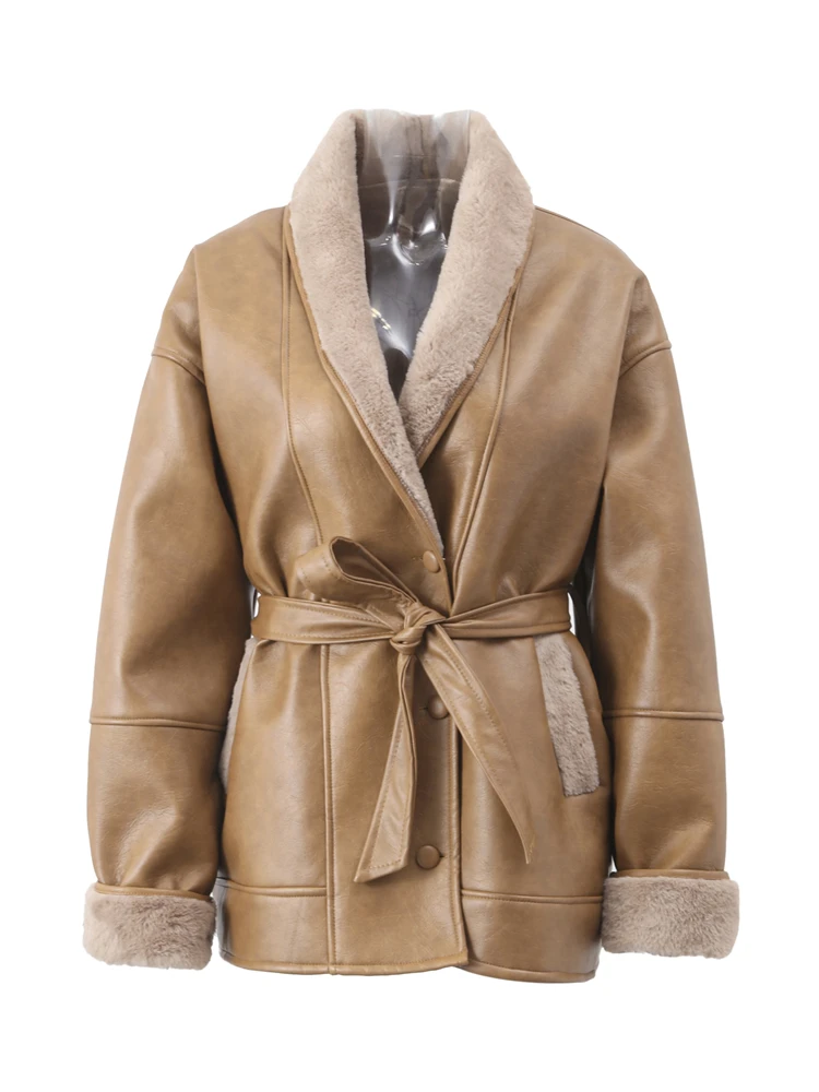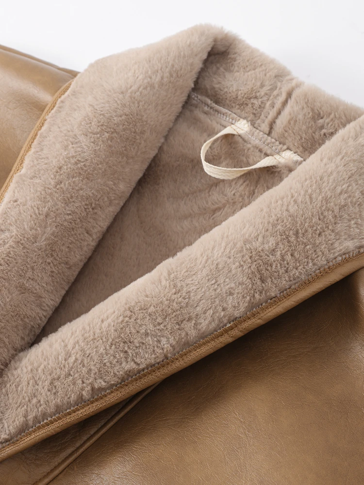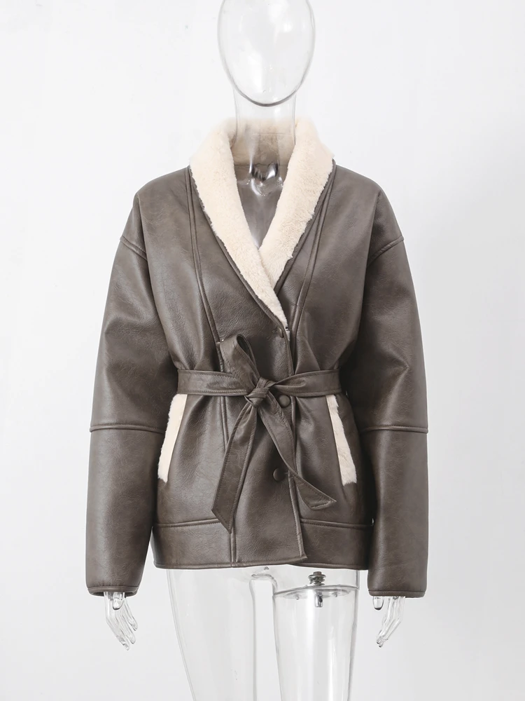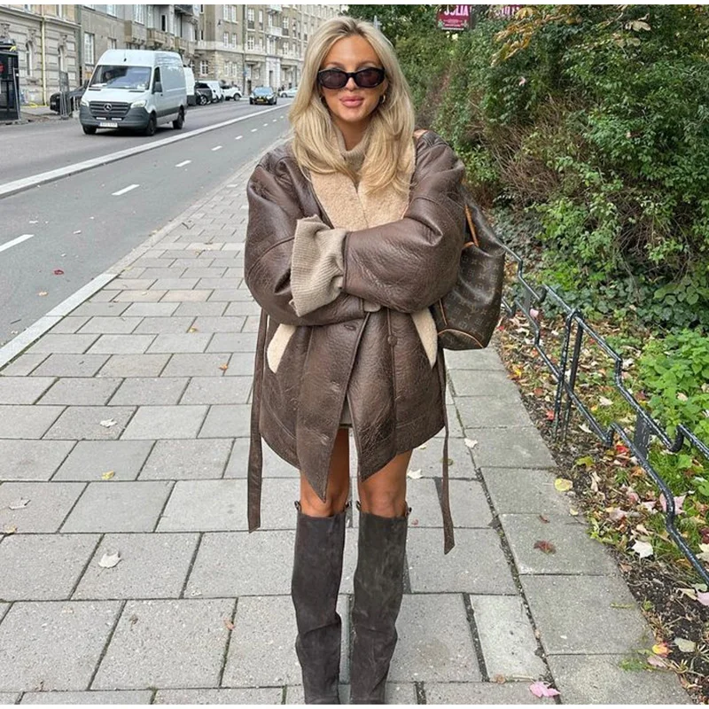 Znbbw Winter Leather Jacket Women 2024 New Female Vintage Lapel Faux Wool Belt Coat Thicken Warm Oversize Highstreet Outwear Top