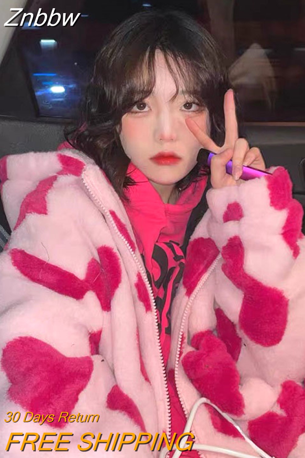 Znbbw Winter Thick Jackets Women Comfortable Sweet Loose Heart-shaped Print Hooded Coat Fashion Casual Warm Couple Tops Streetwear