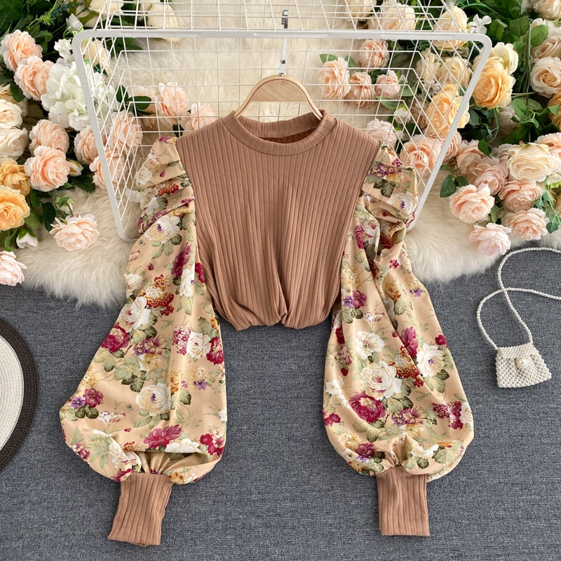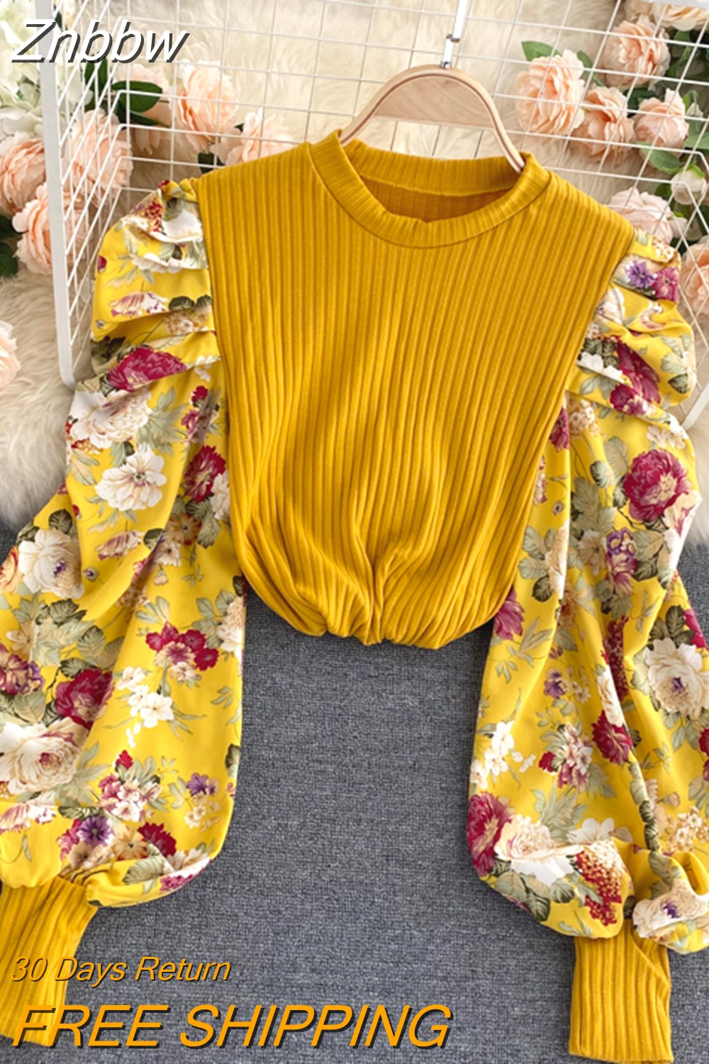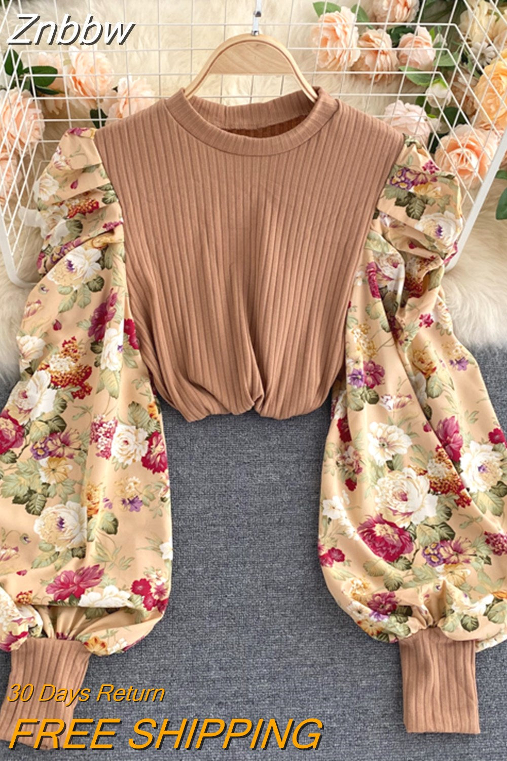 Znbbw Women Autumn New Printed Bottoming Shirt Puff Sleeve Stitching Patchwork O-Neck Temperament Slim Fit Top Female Blouse UK115