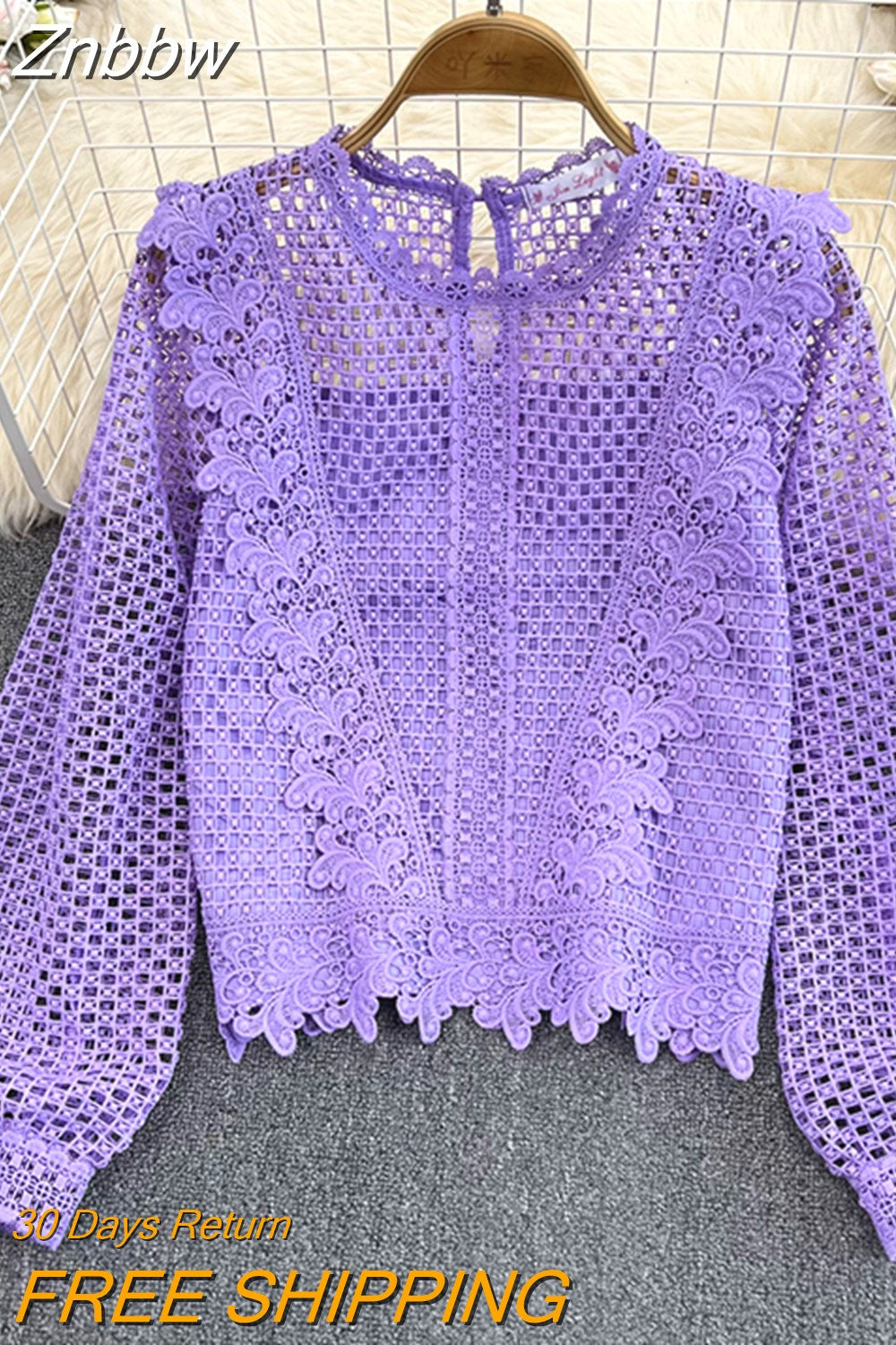 Znbbw Women Autumn Winter Blouse Vintage Round Neck Ruffle Long Sleeve Loose Hook Flower Cut Out Water-soluble Lace Shirt D2062