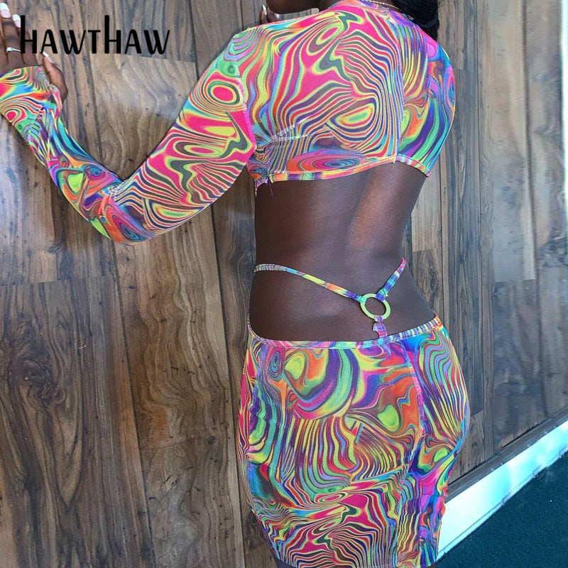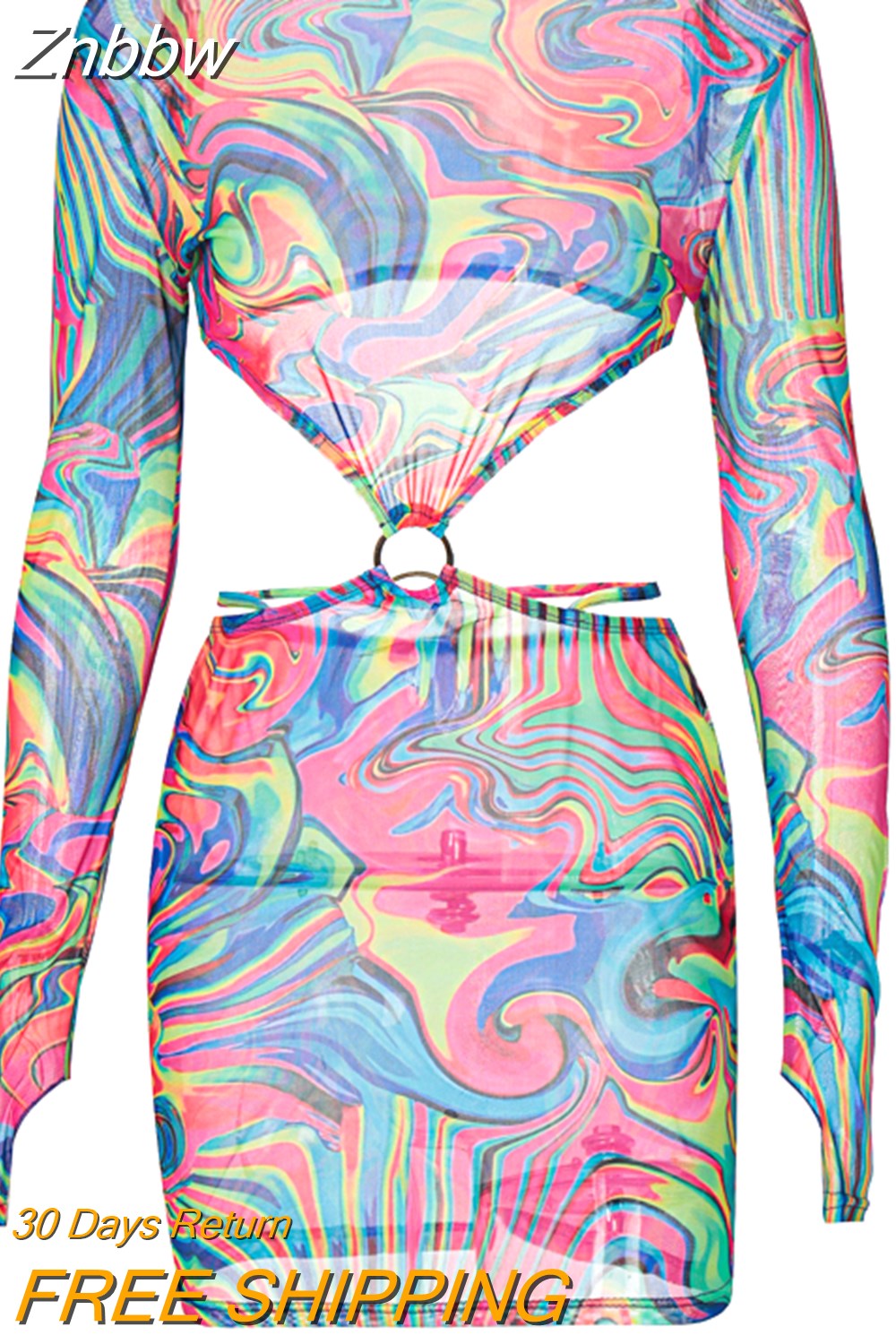 Znbbw Women Autumn Winter Long Sleeve Hollow Out Printed Mesh Backless Bodycon Mini Dress 2023 Female Clothing Streetwear
