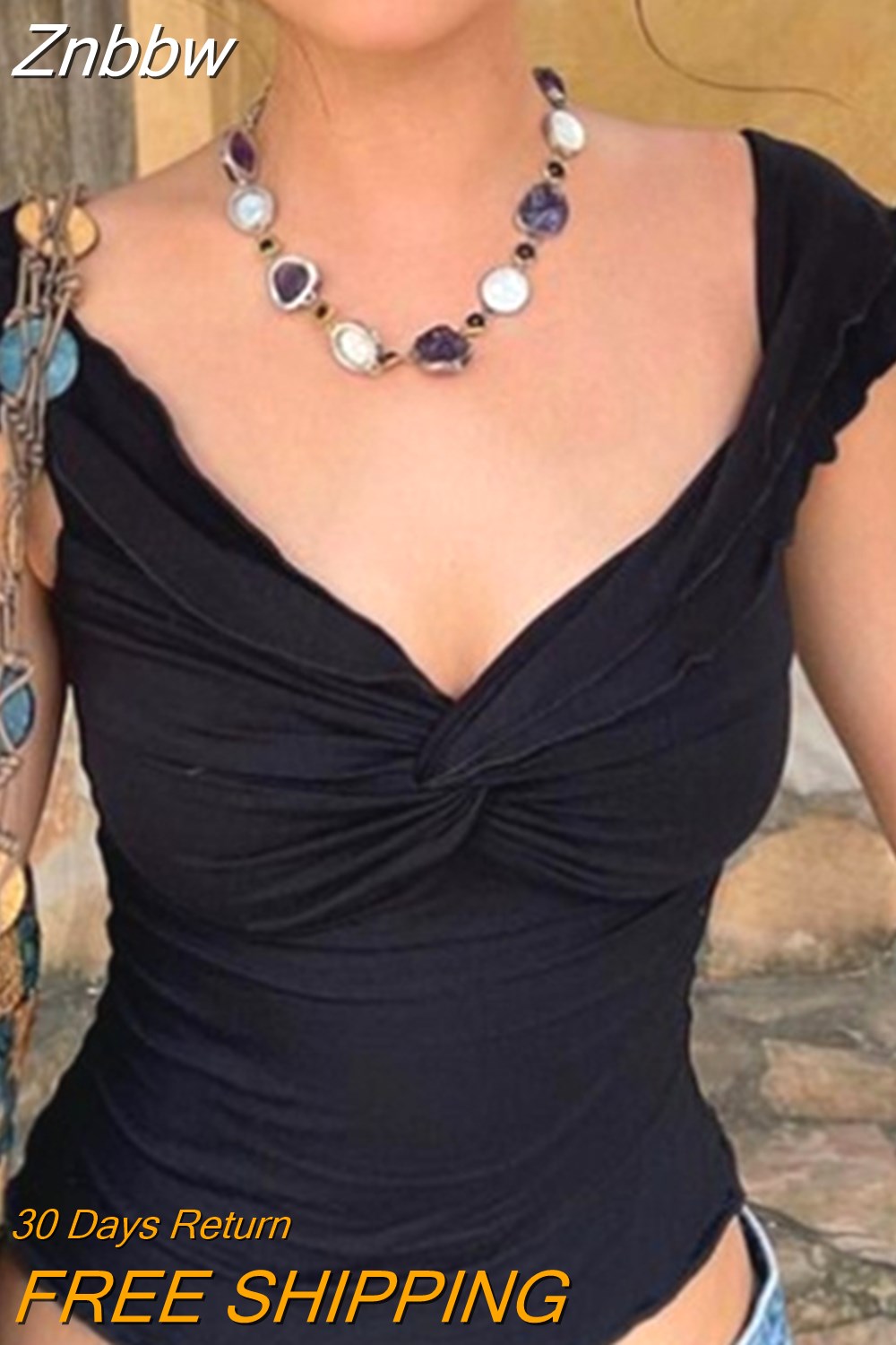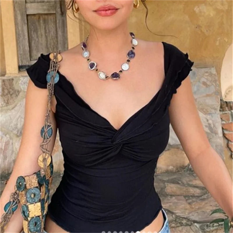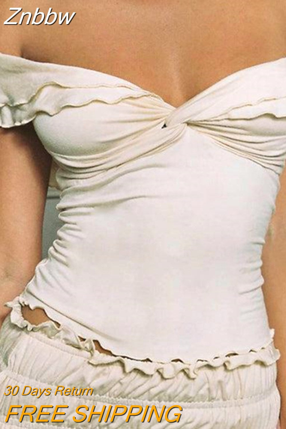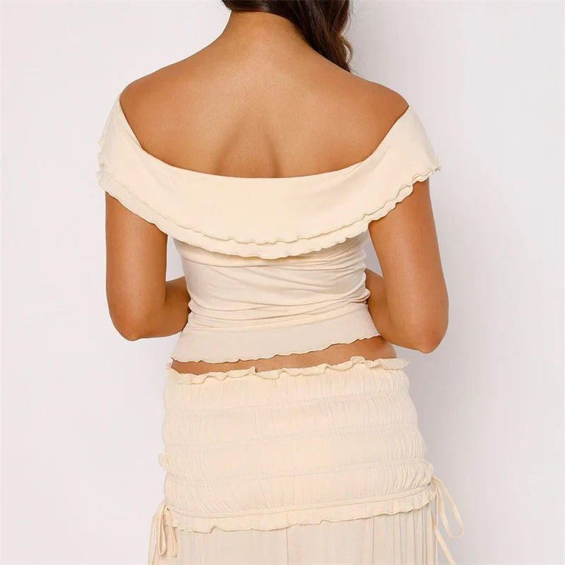 Znbbw Women Chic Lettuce Trim Crop Tops Off Shoulder Short Sleeve Twist Knot Front Solid Color T-Shirts Y2K Aesthetic Clothes