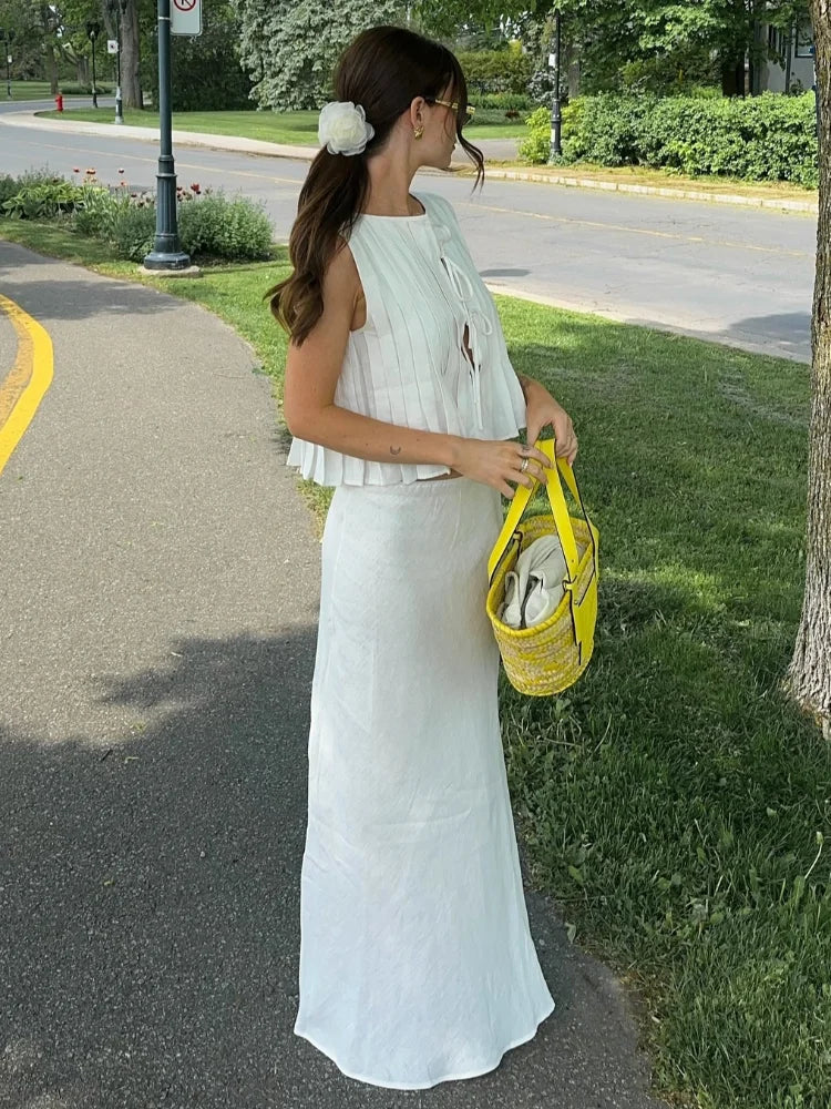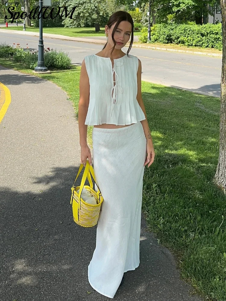 Znbbw Women Cotton Linen Folded Ruffles Lace Up Top Suits Elegant Sleeveless Vest Chic Long Skirt Set Summer Lady Office Street Outfit