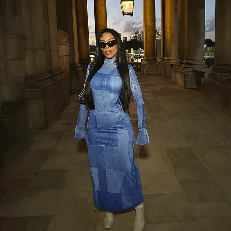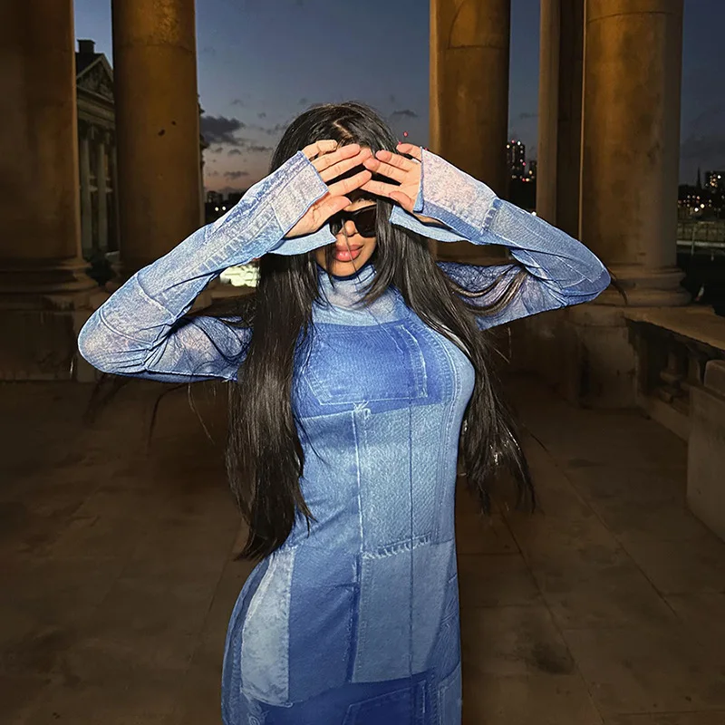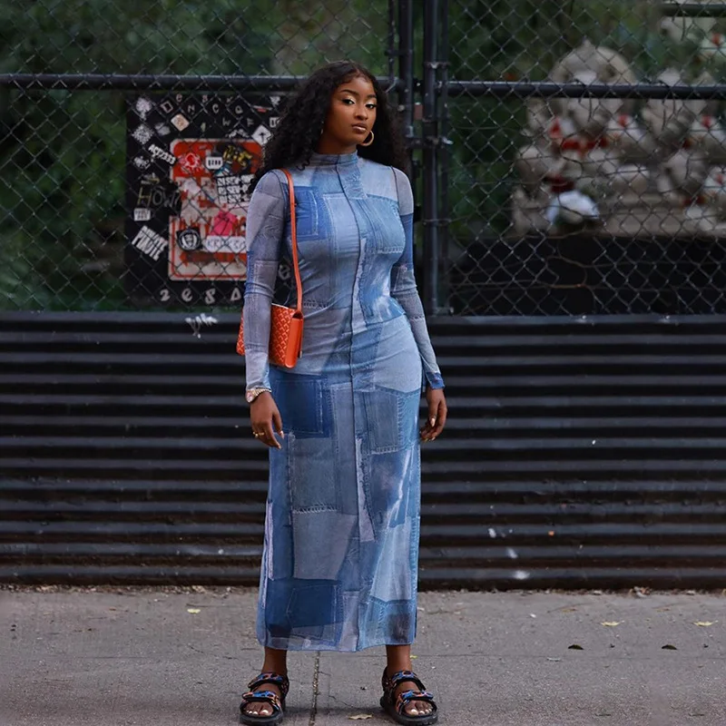 Znbbw Women Fashion Long Sleeve Bodycon Printed Streetwear Midi Dress 2023 Autumn Fall Clothing Wholesale Items For Business