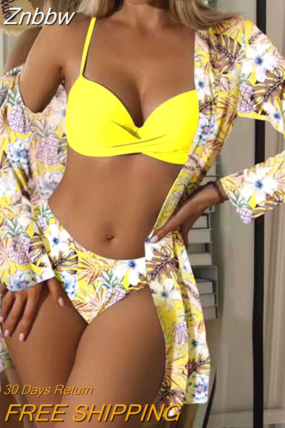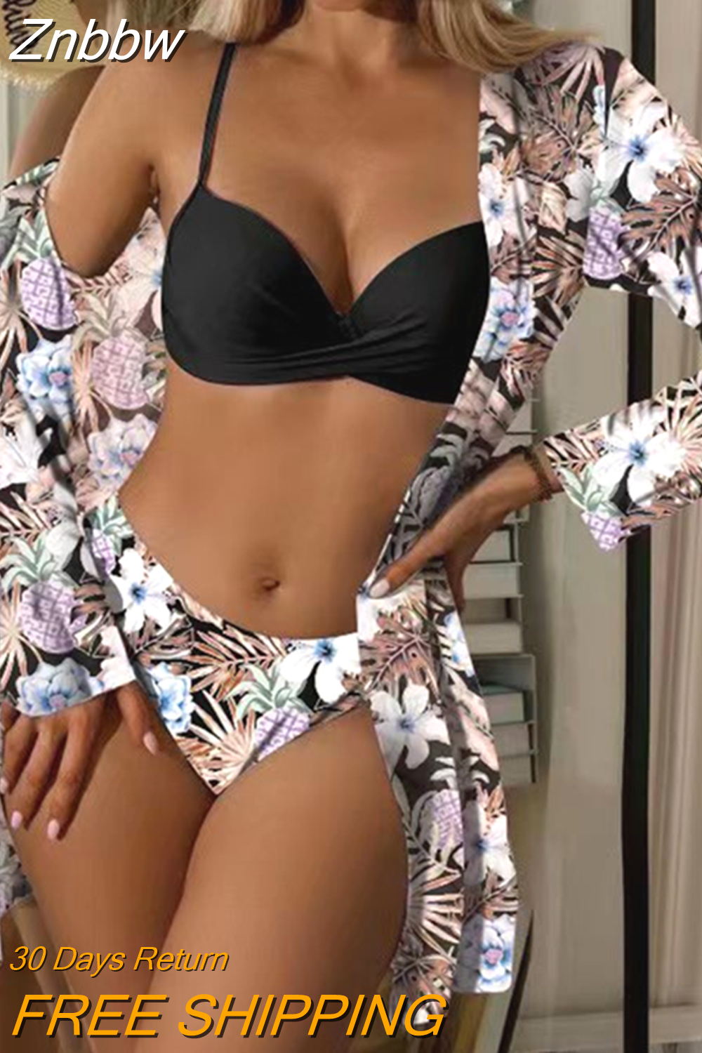 Znbbw Women Gauze Floral Printed Bikini Swimwear Set Full Sleeve Cover Up Three Pieces Sets 2023 Fashion Summer Beach Bathing Suit