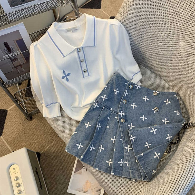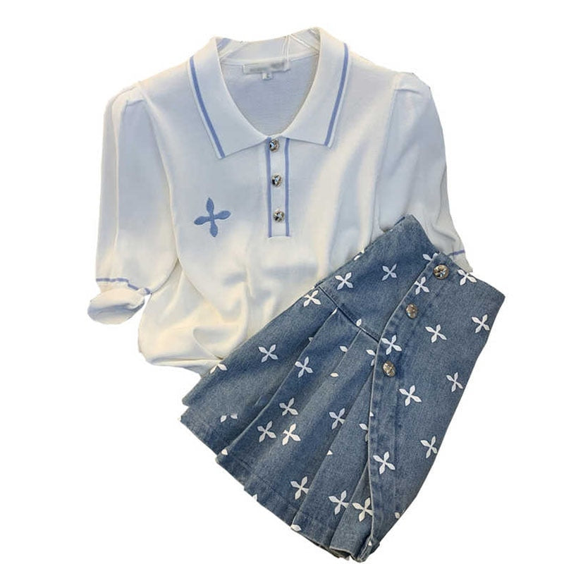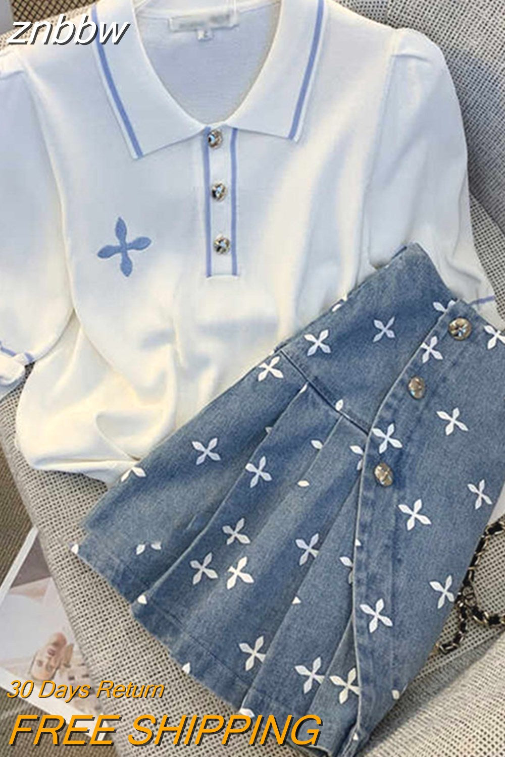 znbbw Women High Quality Summer 2-piece Set O-Neck Black Short Sleeve Knit Tops+Blue Printed Denim Mini Skirt Suit Female Outfits