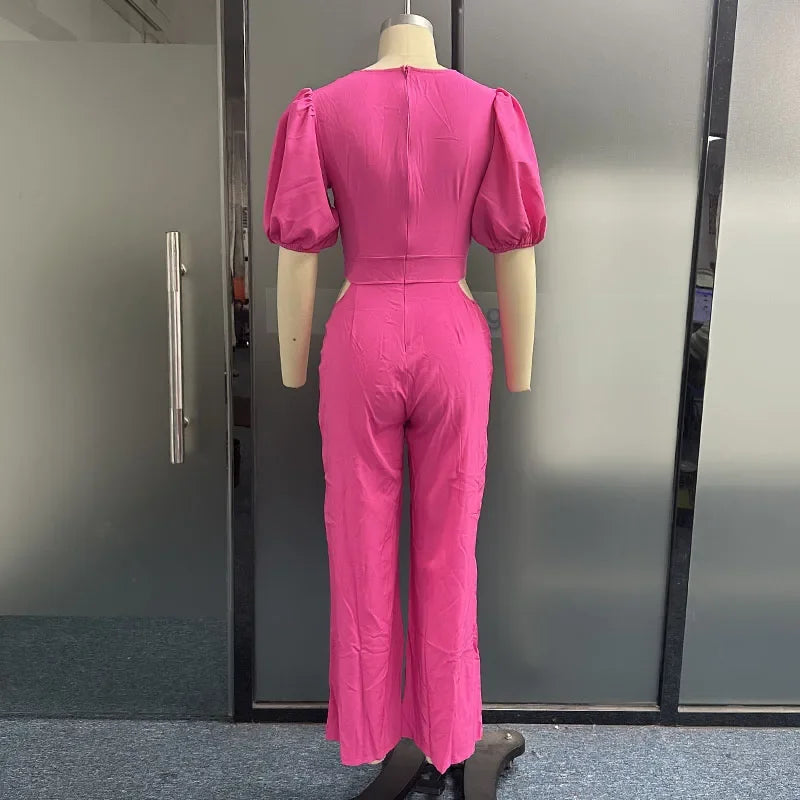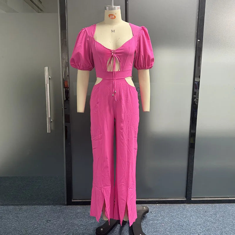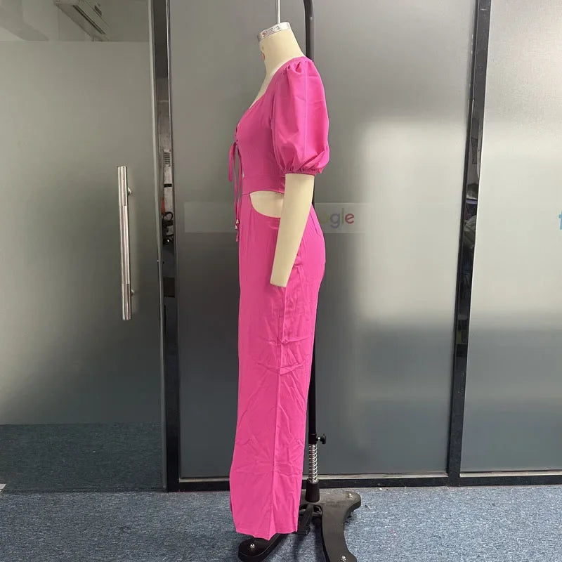 Znbbw Women Jumpsuit Puff Sleeves V Neck Lace Up Nipped Waist Hollow Out Loose Wide Legs Casual Pants Romper High Streetwear