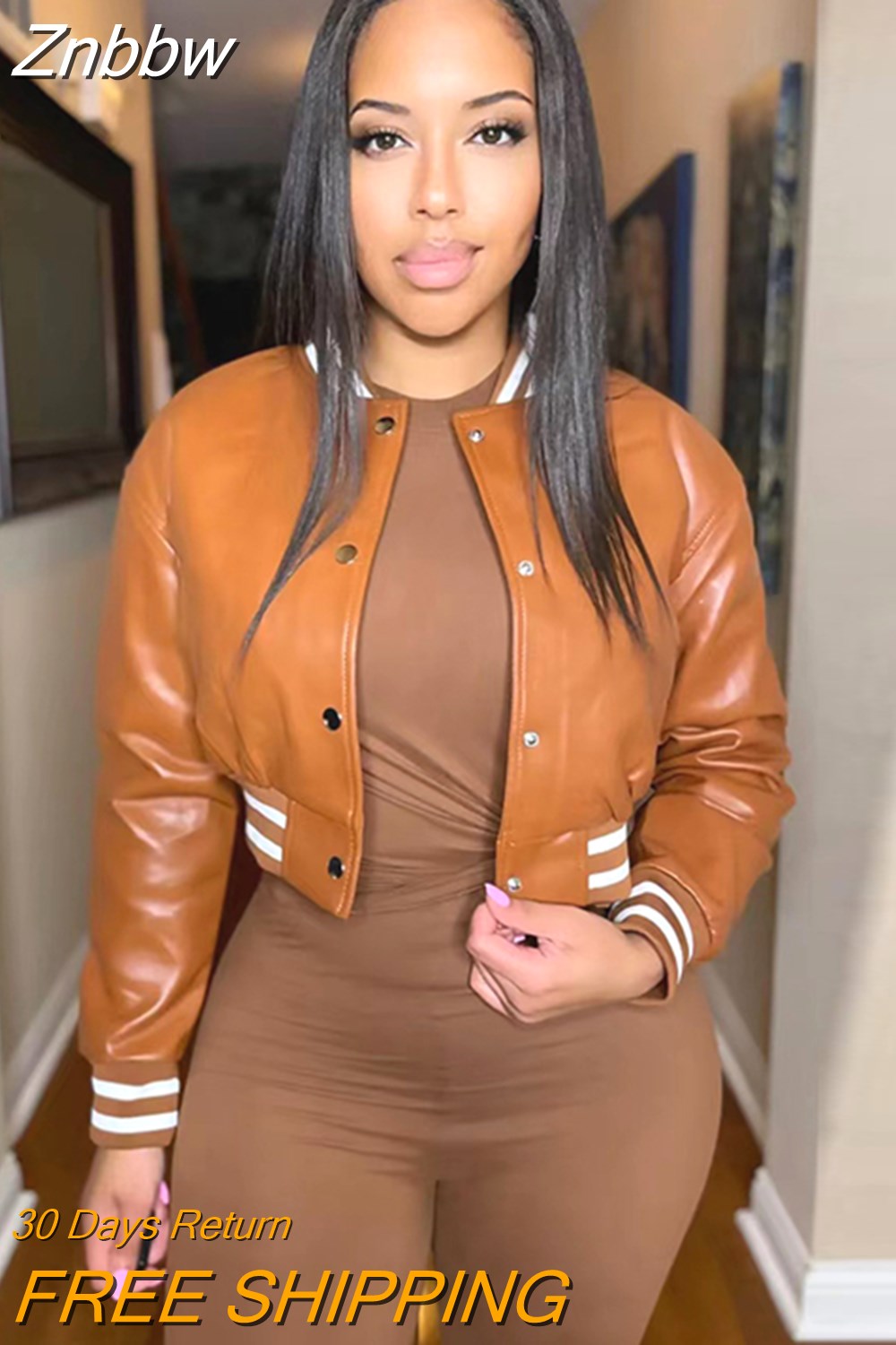 Znbbw Women Letter B Single Breasted PU Faux Leather Short Coat Lady Full Sleeve Jackets Female O-Neck Button Down Slim Fit Streetwear