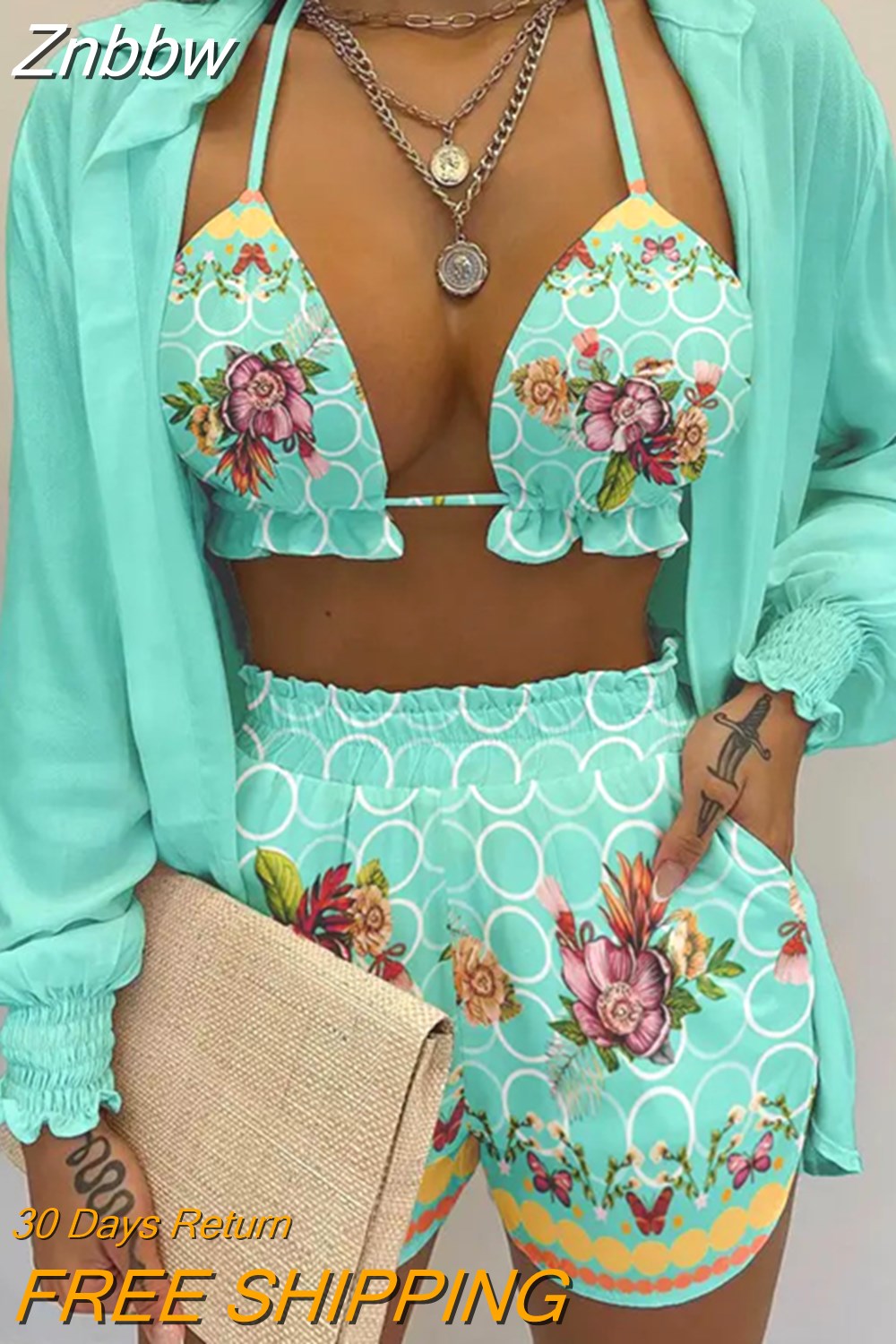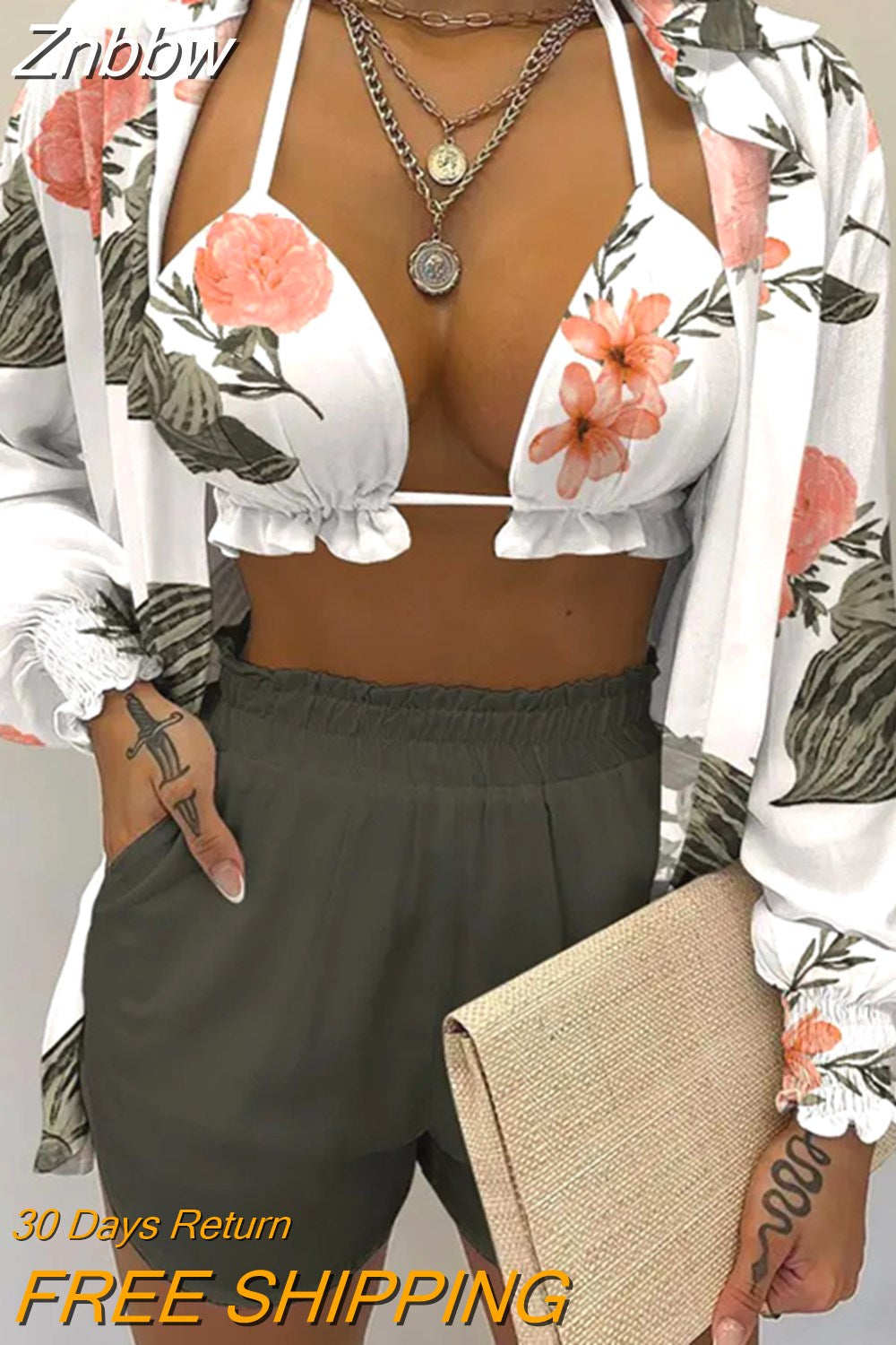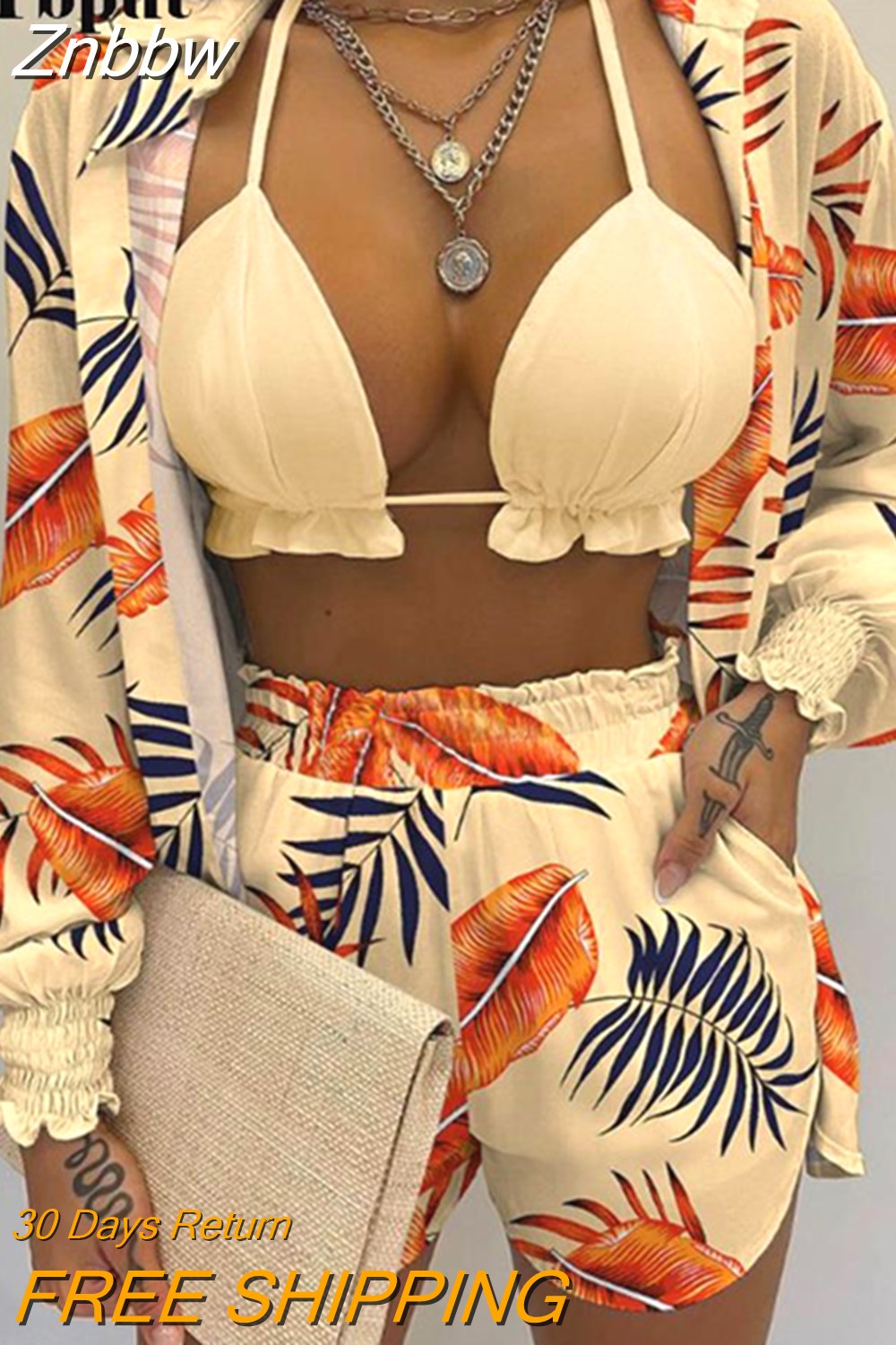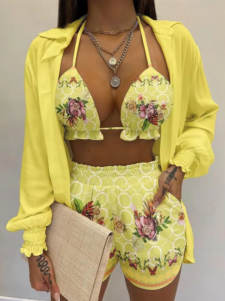 Znbbw Women Printed High Waist Bikini 3 Pieces Set Female Sexy Full Sleeve Cover Up Swimsuit 2023 New Bathing Shorts Swimwear Suits
