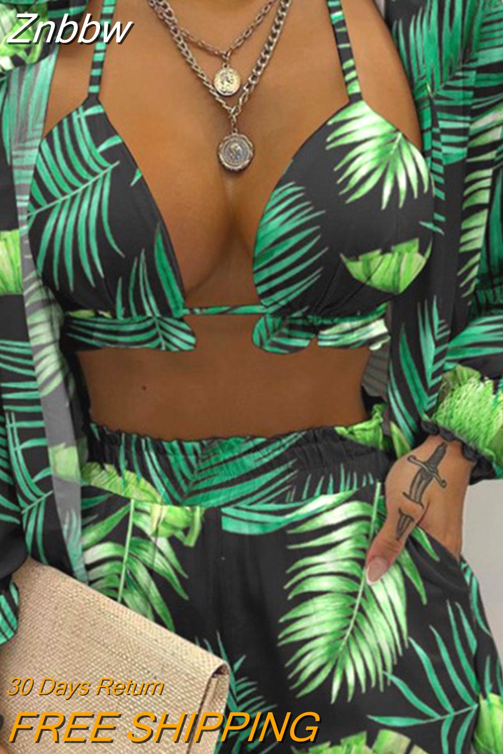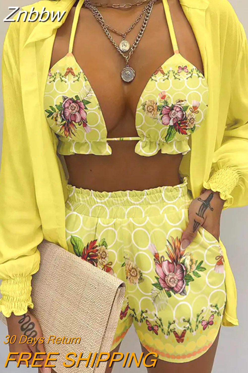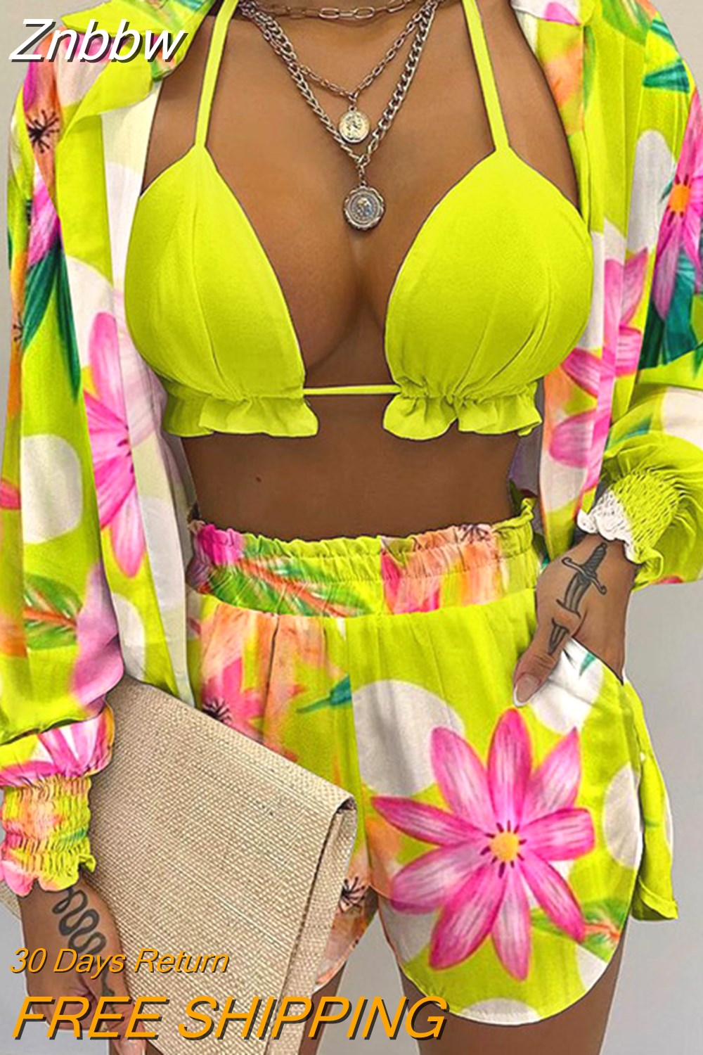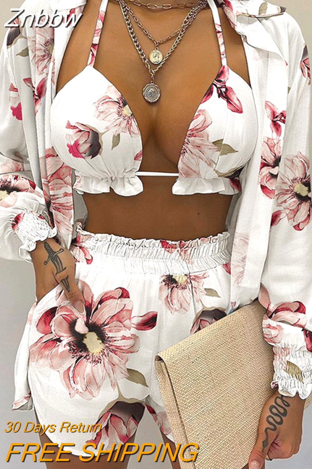 Znbbw Women Printed High Waist Bikini 3 Pieces Set Female Sexy Full Sleeve Cover Up Swimsuit 2023 New Bathing Shorts Swimwear Suits