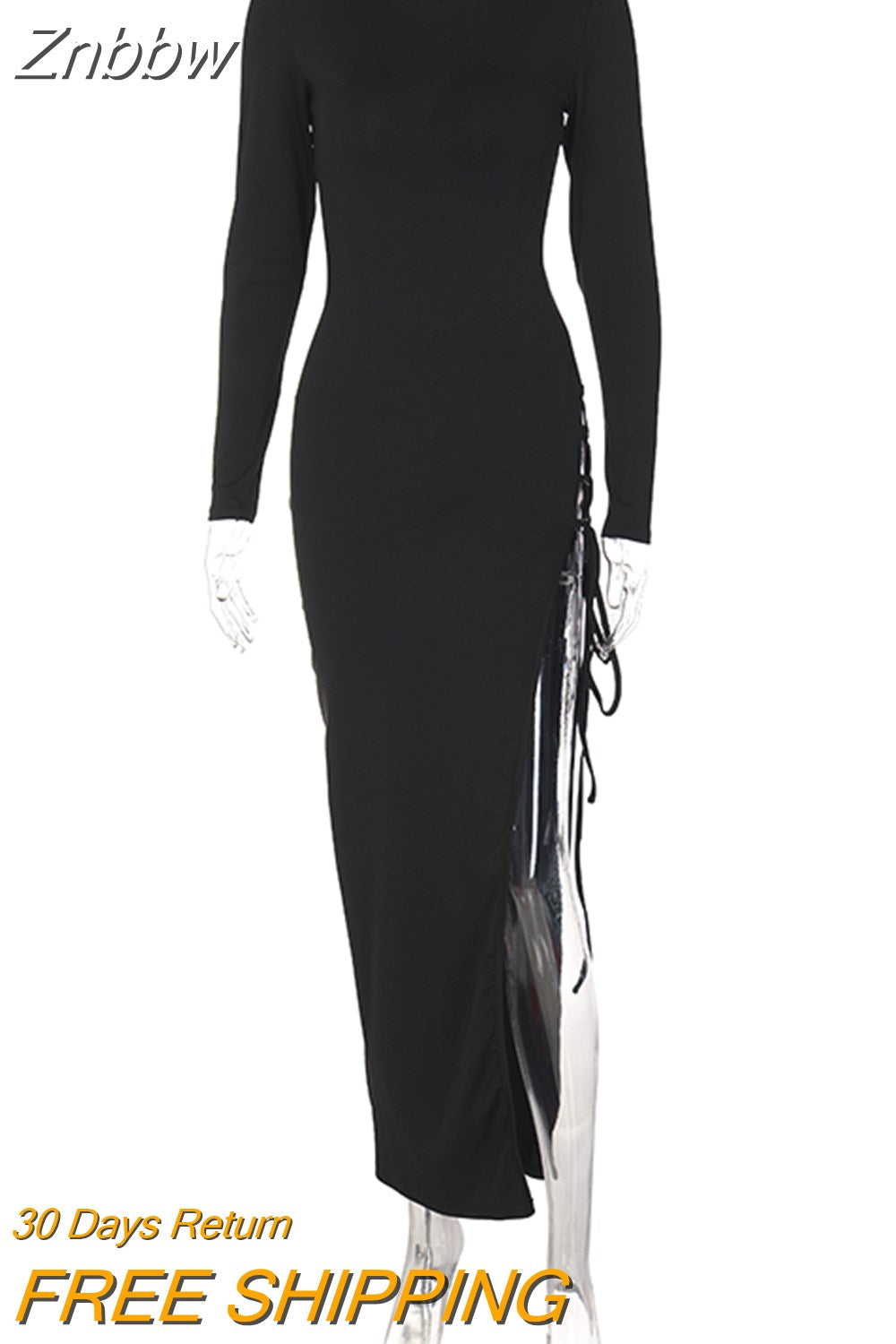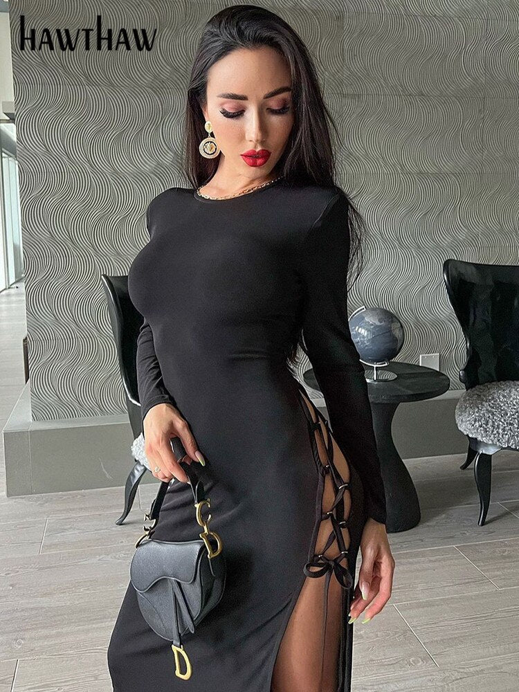 Znbbw Women Sexy Long Sleeve Hollow Out Party Club Bodycon Black Split Long Dress 2023 Spring Autumn Clothes Wholesale Items