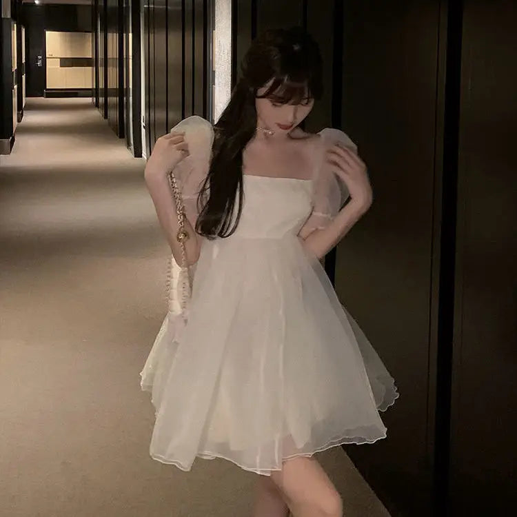 Znbbw Women Sexy Mesh Skirt Sweet Kawaii Japanese Fairy Party Elegant Dresses Summer Fashion Bubble Sleeve White Short Sleeve Dress