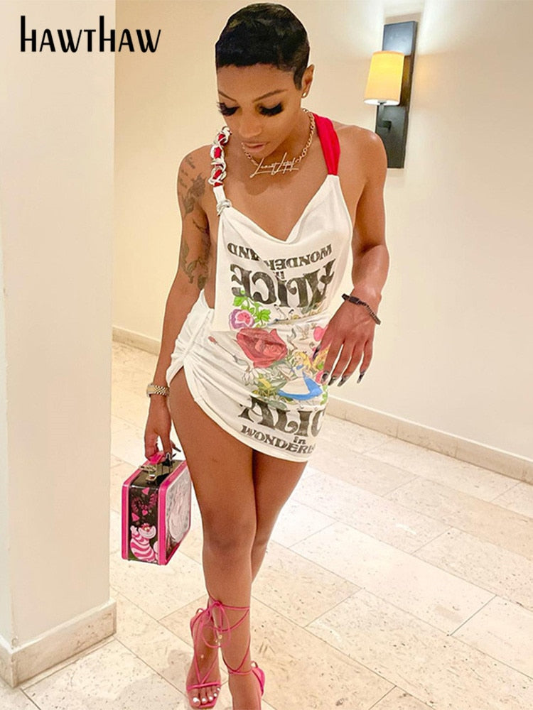 Znbbw Women Sexy V Neck Halter Party Club Printed Backless Bodycon White Mini Dress 2023 Summer Wholesale Items For Business