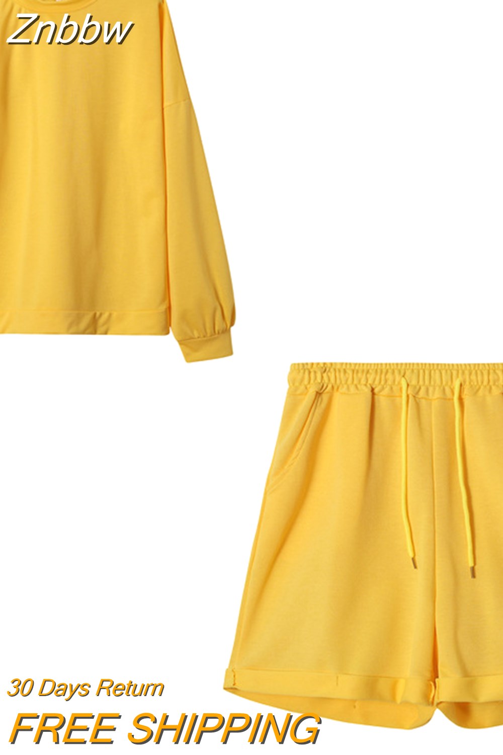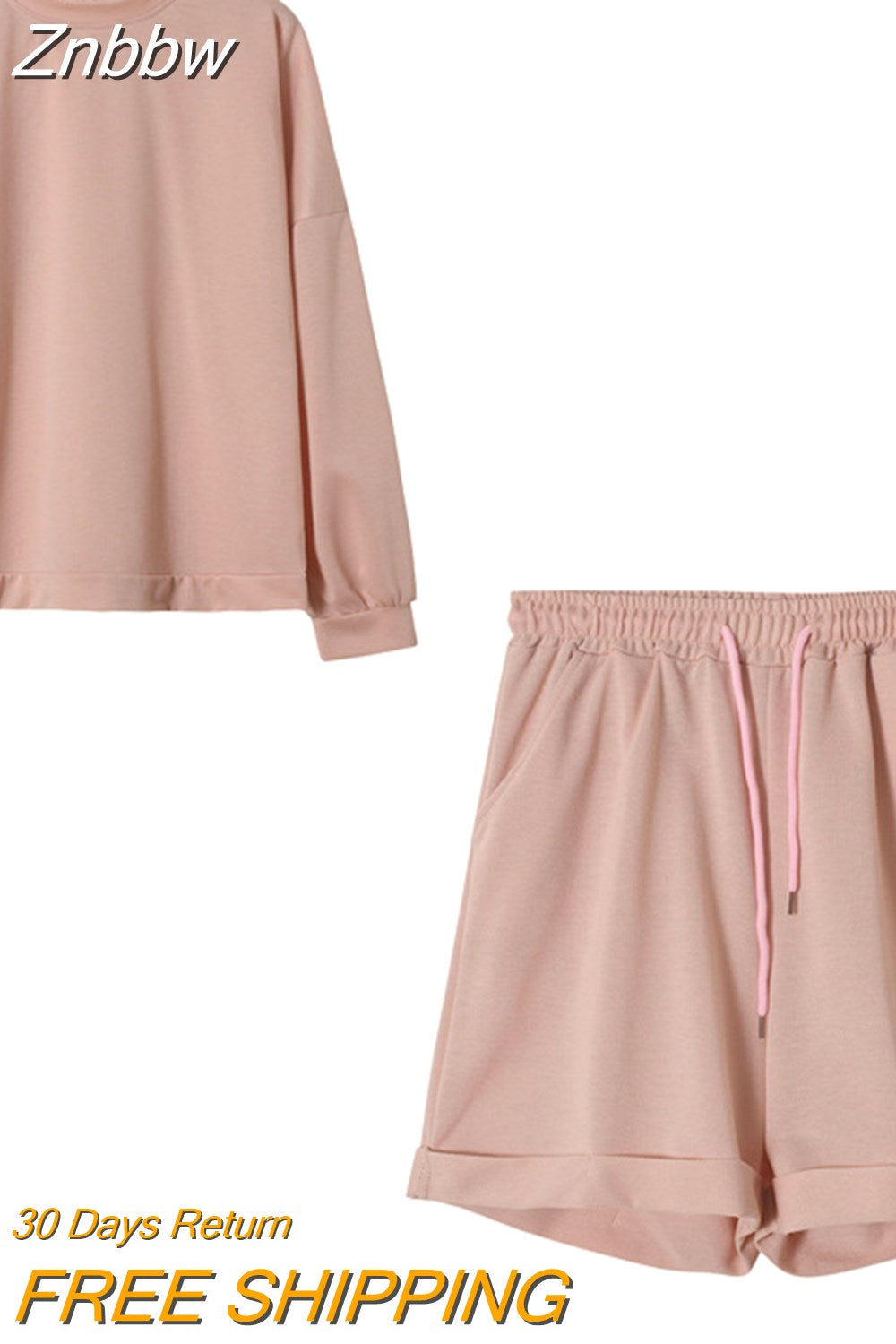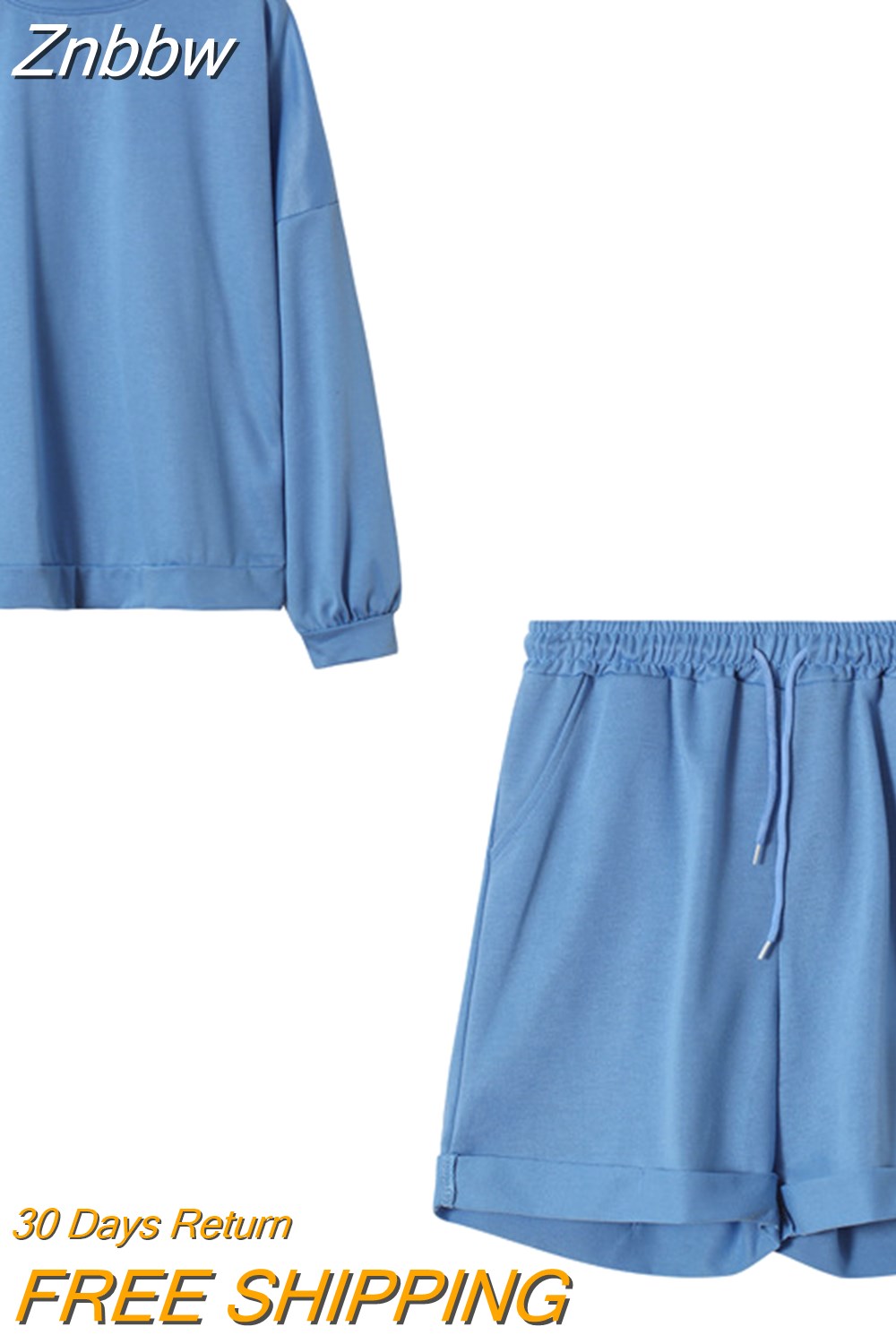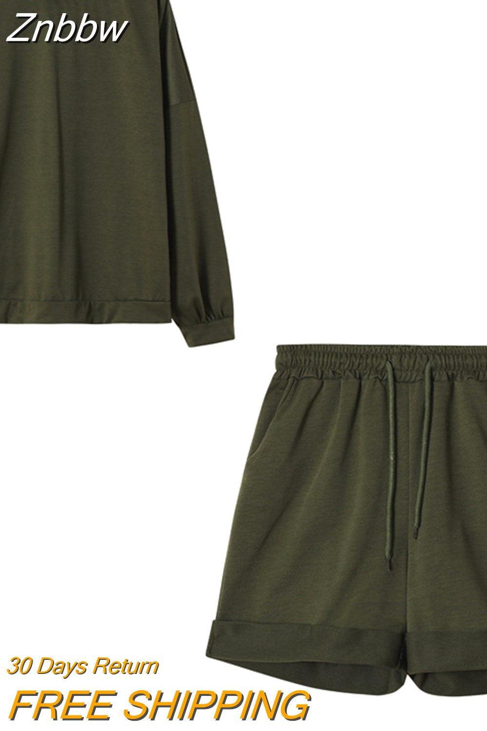 Znbbw Women Solid Tracksuits Casual Long Sleeve Pullover with Pockets Shorts Two Piece Set Sport Fashion Loose Matching Sets Outfits
