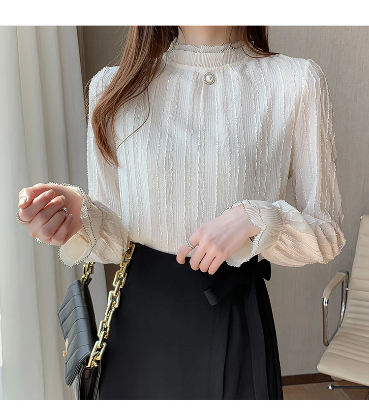 Znbbw Women Stand Collar Lace Chiffon Blouse Shirt Tops Long Sleeve Blouse Women Blusas Mujer De Moda 2023 Blouses Female E127