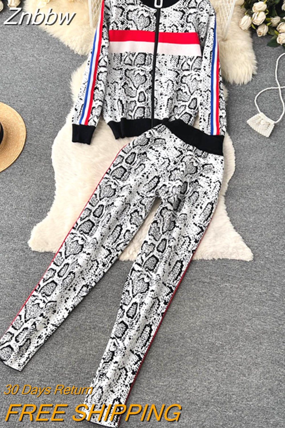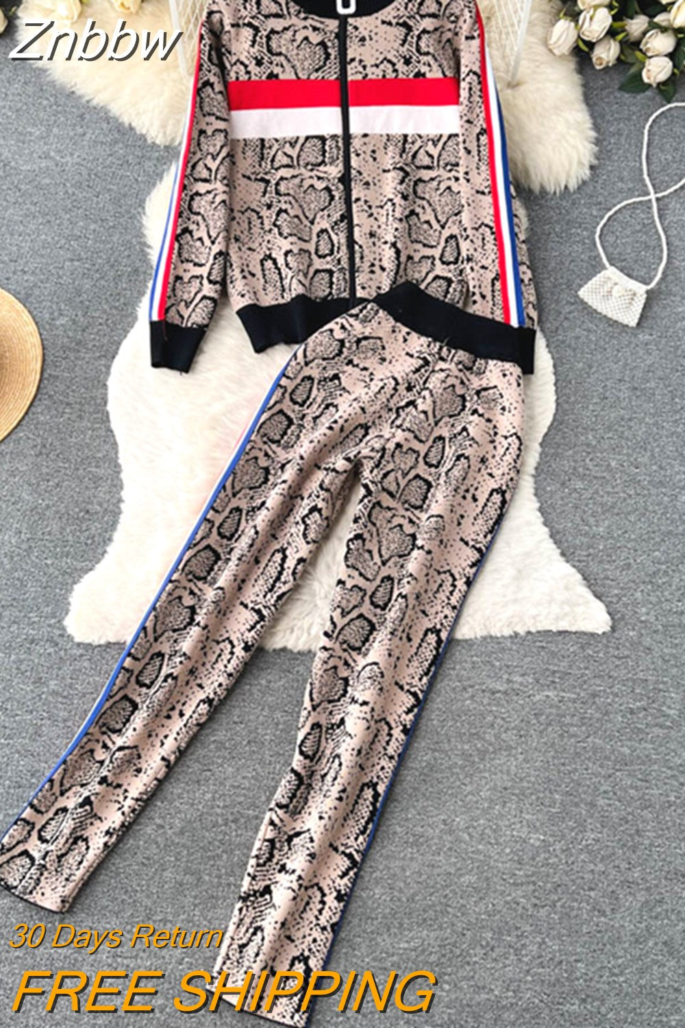 Znbbw Women Stripe Zipper Knitted Cardigans Jacket Sweaters + Pencil Pants Sets Woman Fashion Jumpers Trousers 2 PCS Costumes Outfit