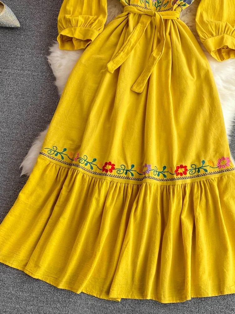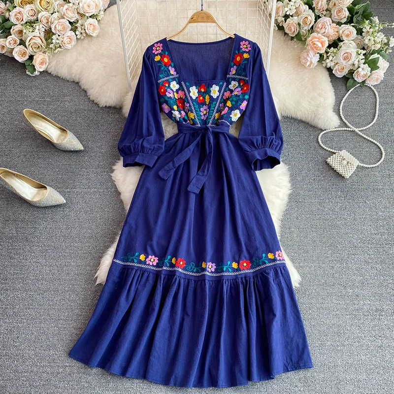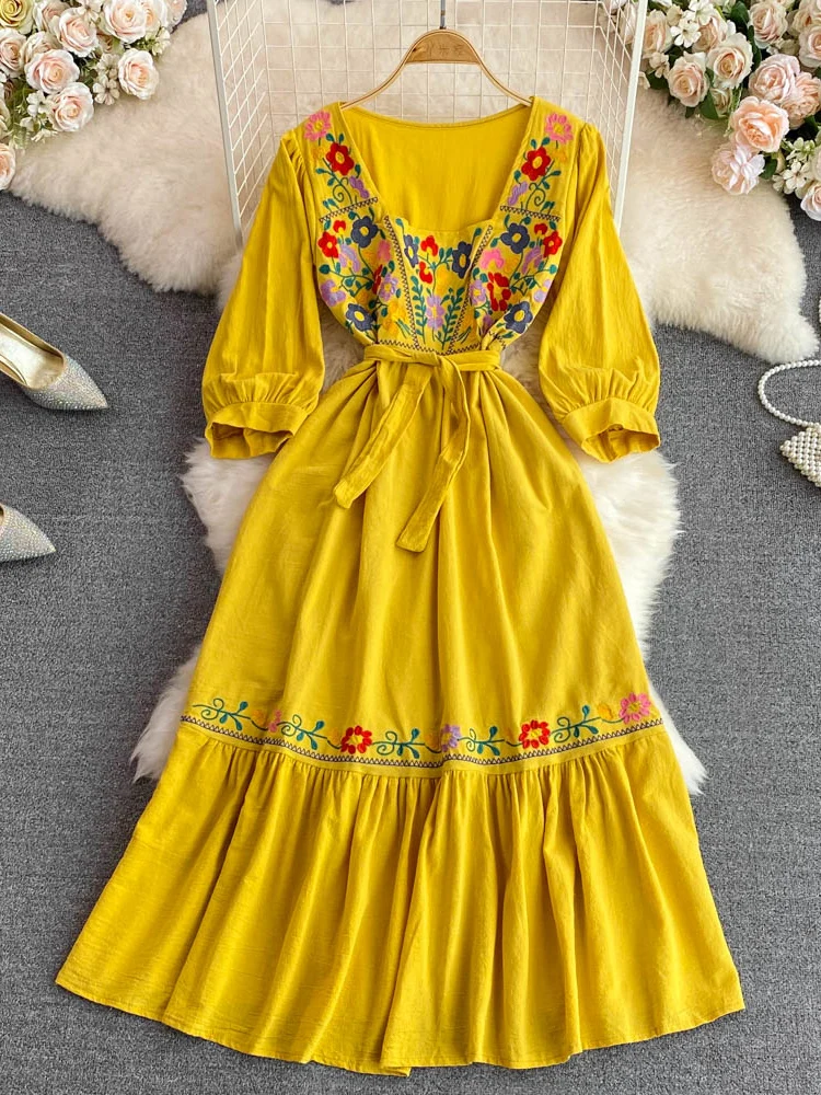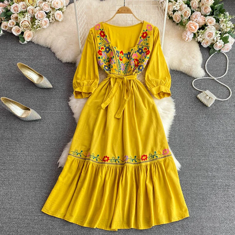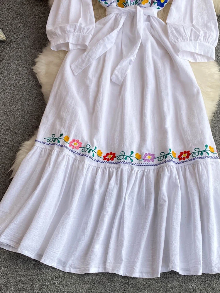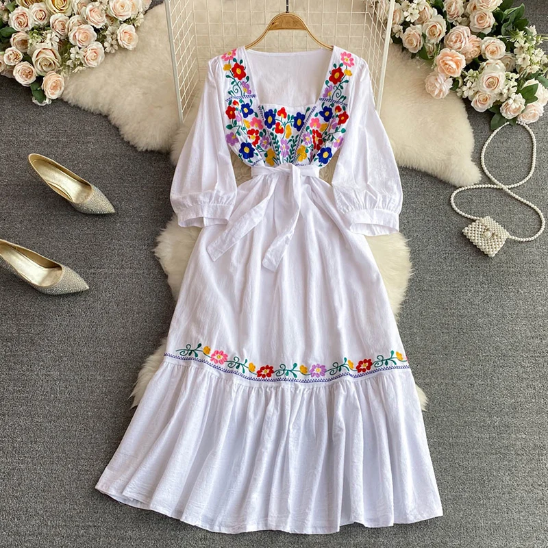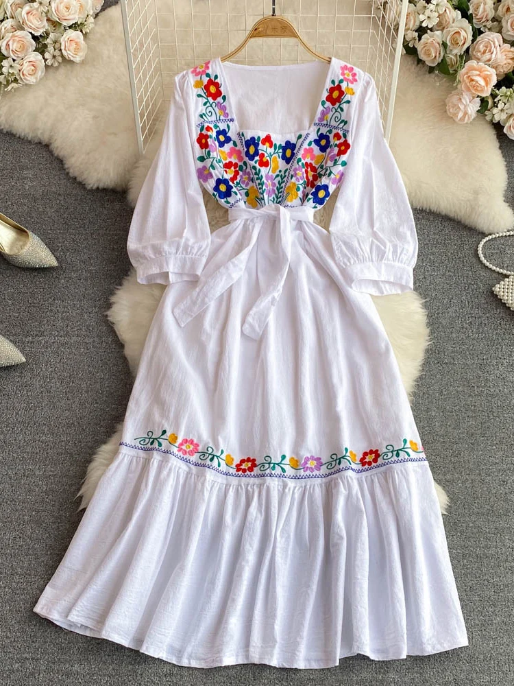 Znbbw Women Summer Dress Retro Bohemian National Style Square Collar Embroidery Seaside Holiday Big Hem Long Vestidos D2473