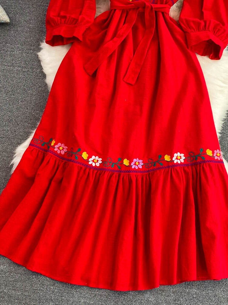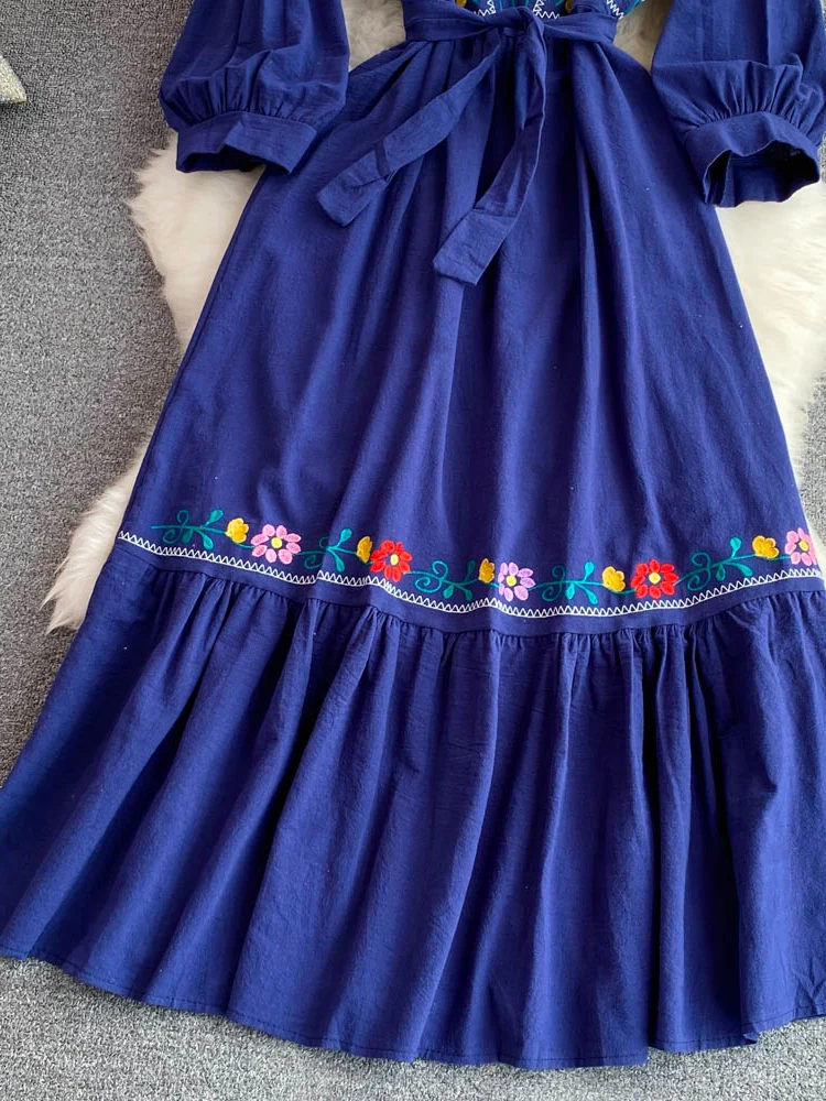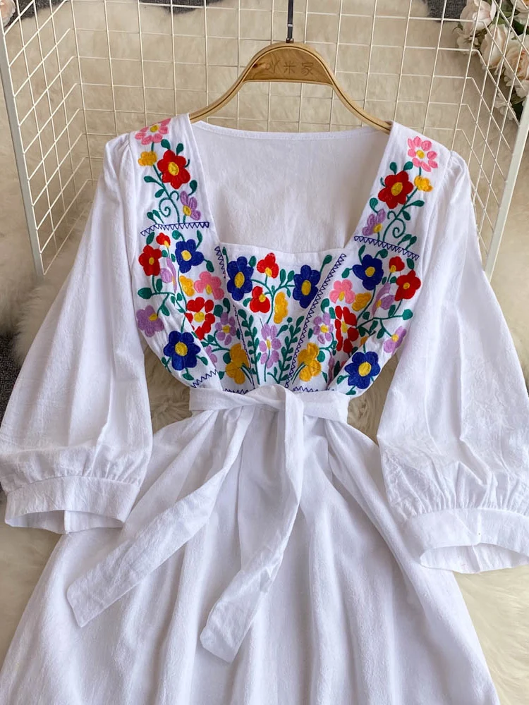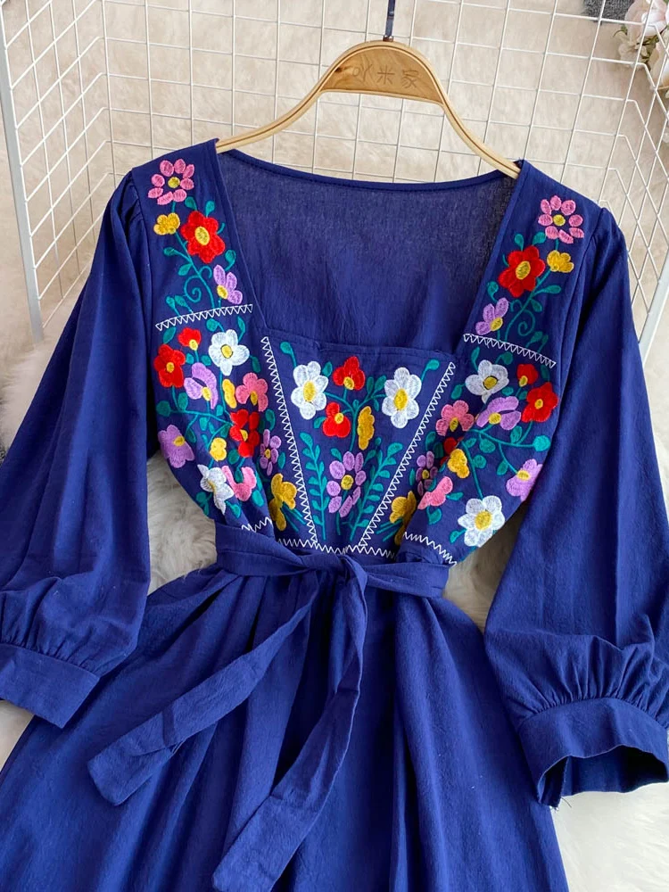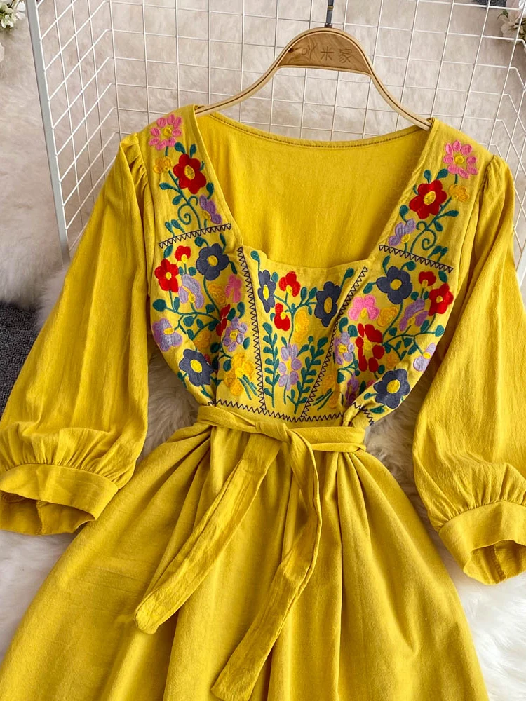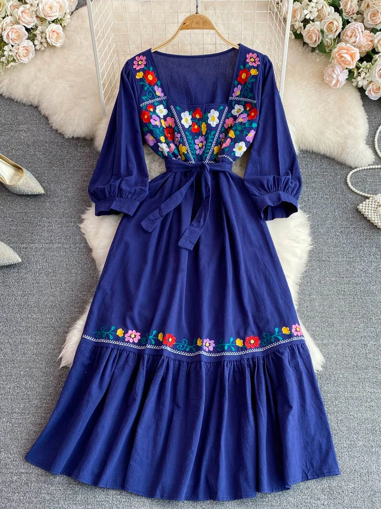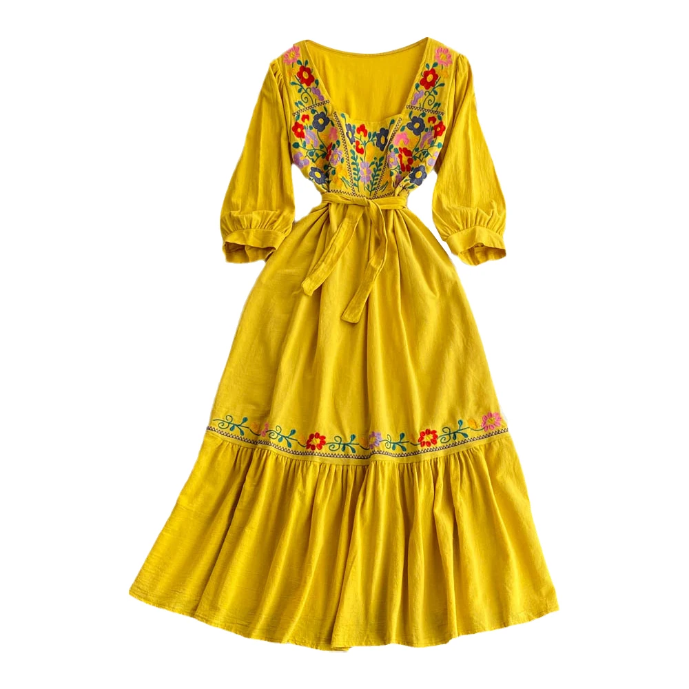 Znbbw Women Summer Dress Retro Bohemian National Style Square Collar Embroidery Seaside Holiday Big Hem Long Vestidos D2473
