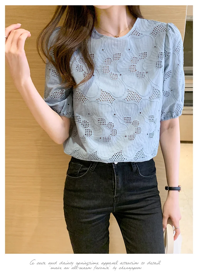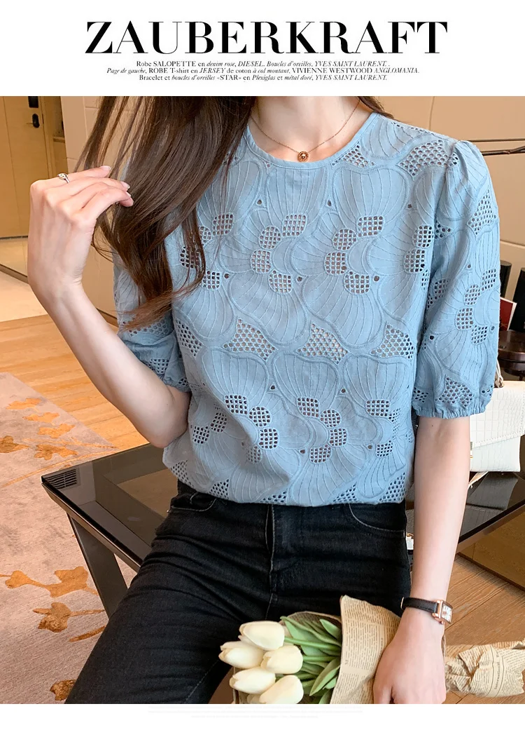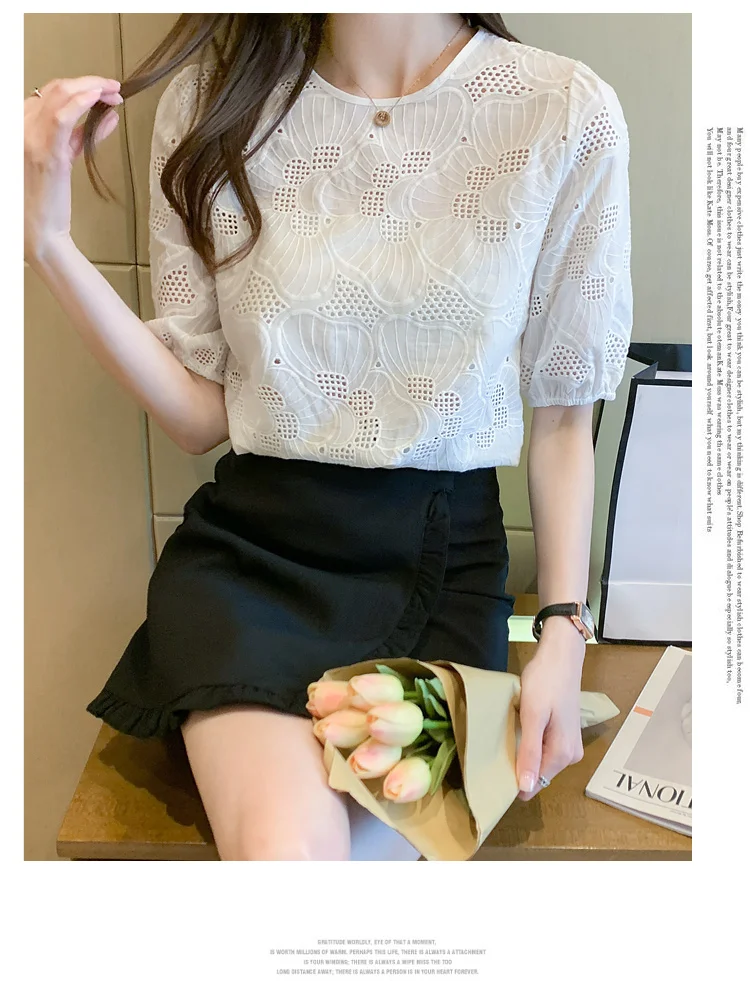 Znbbw Women White Blouse Tops Short Sleeve Hollow Chiffon Blouse Shirt Blouse Women Blusas Mujer De Moda 2023 Blouses Top E949