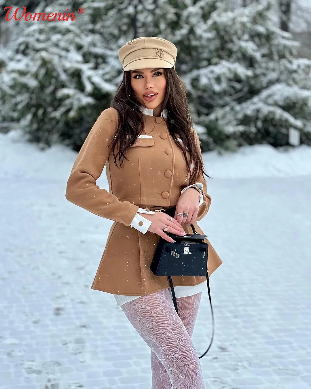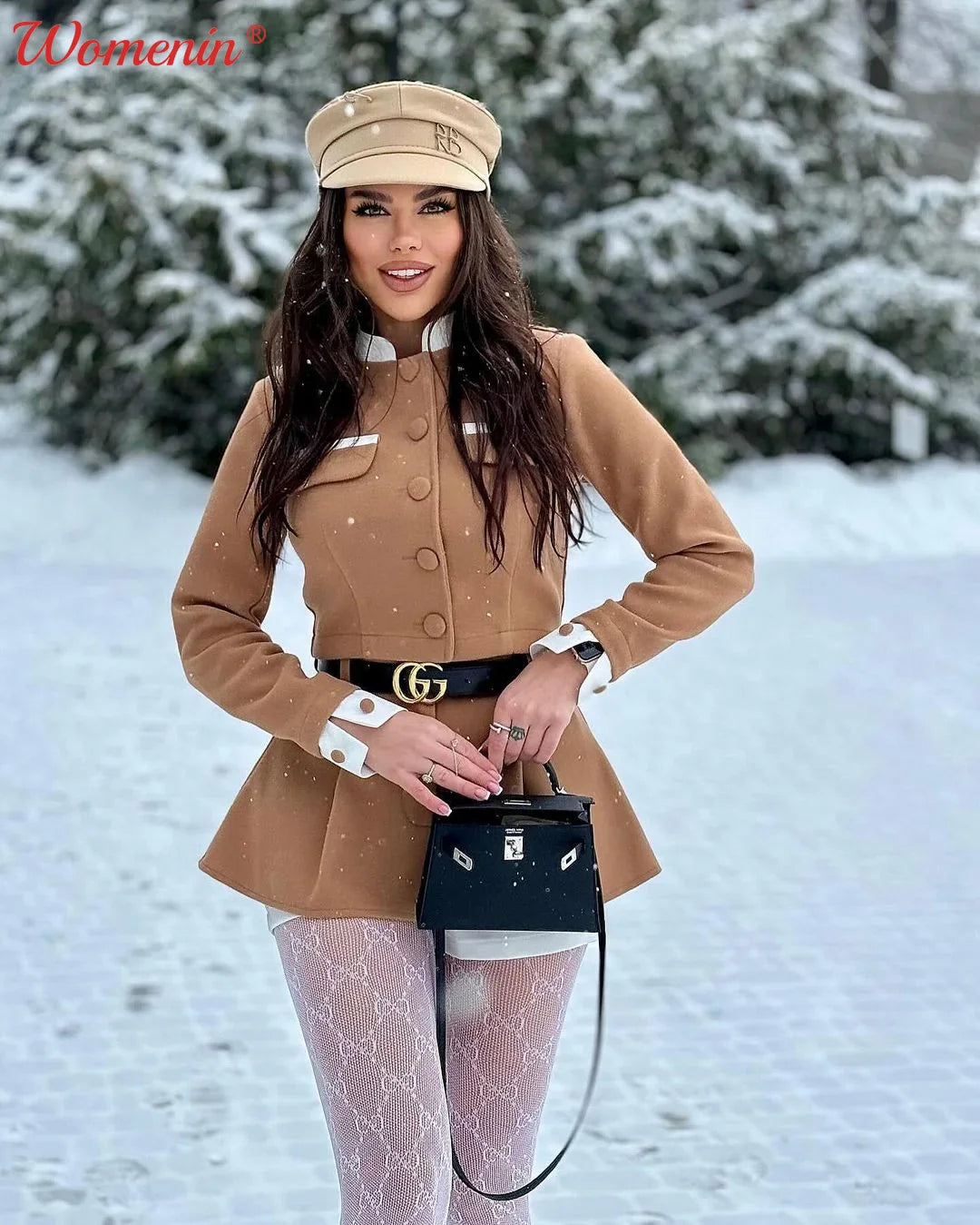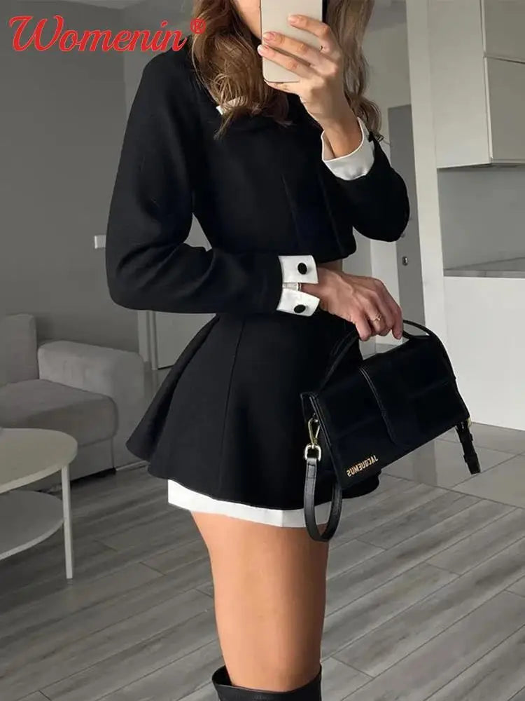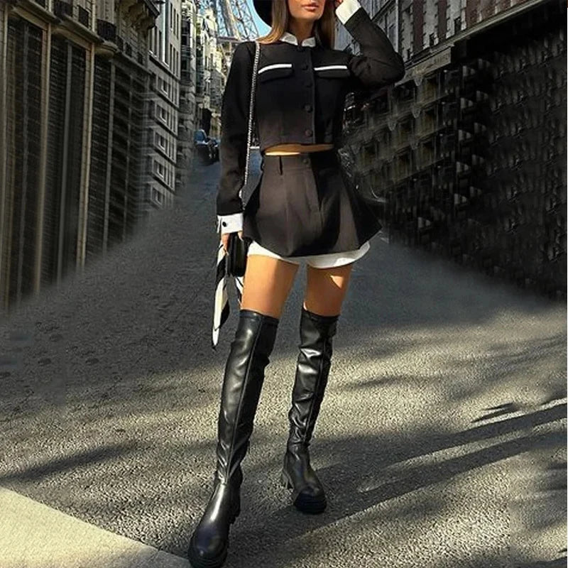 Znbbw Women Woolen Shorts Sets Long Sleeve Stand Collar Button-up Cropped Top High Waist Pleated Zipper Mini Skirt Lady Short Networks