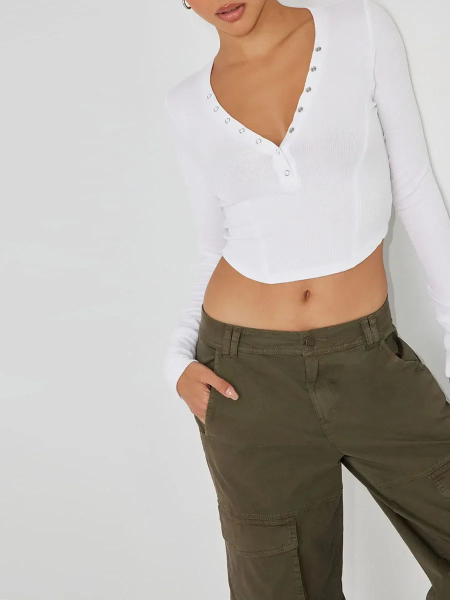 Znbbw Women Y2K Crop Tops Solid Color Deep V Neck Long Sleeve Henley Shirt Button Down Casual Basic Blouses for Going Out Streetwear