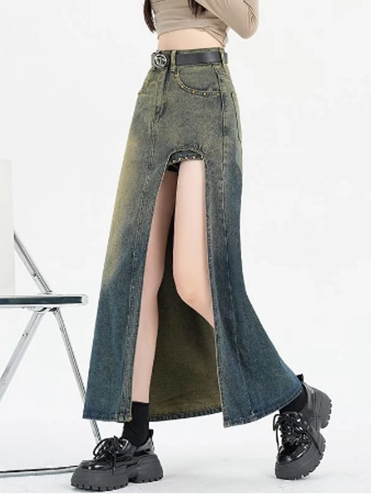Znbbw Women's Blue A-line Denim Skirt with Slit Vintage Aesthetic Y2k Jean Skirt Harajuku Korean Long Skirt 2000s Clothes Summer 2024