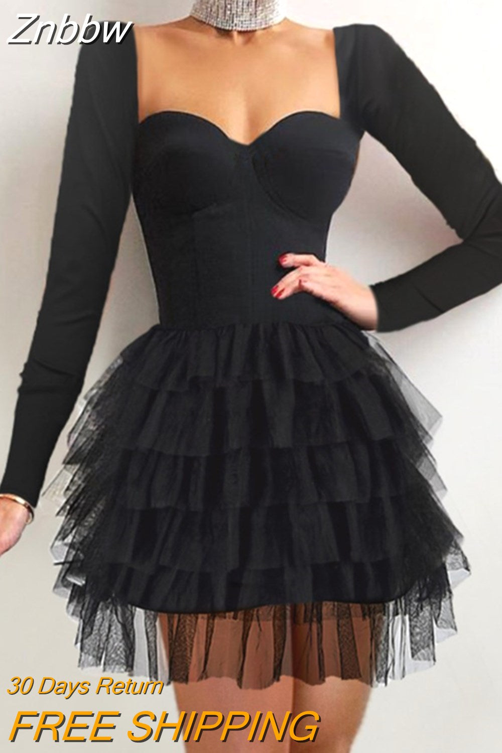 Znbbw Women's Mesh Dress Elegant Long Sleeve/Off-Shoulder High Waist Tulle Tutu A-Line Dress Formal Party Ladies Solid Color Vestido