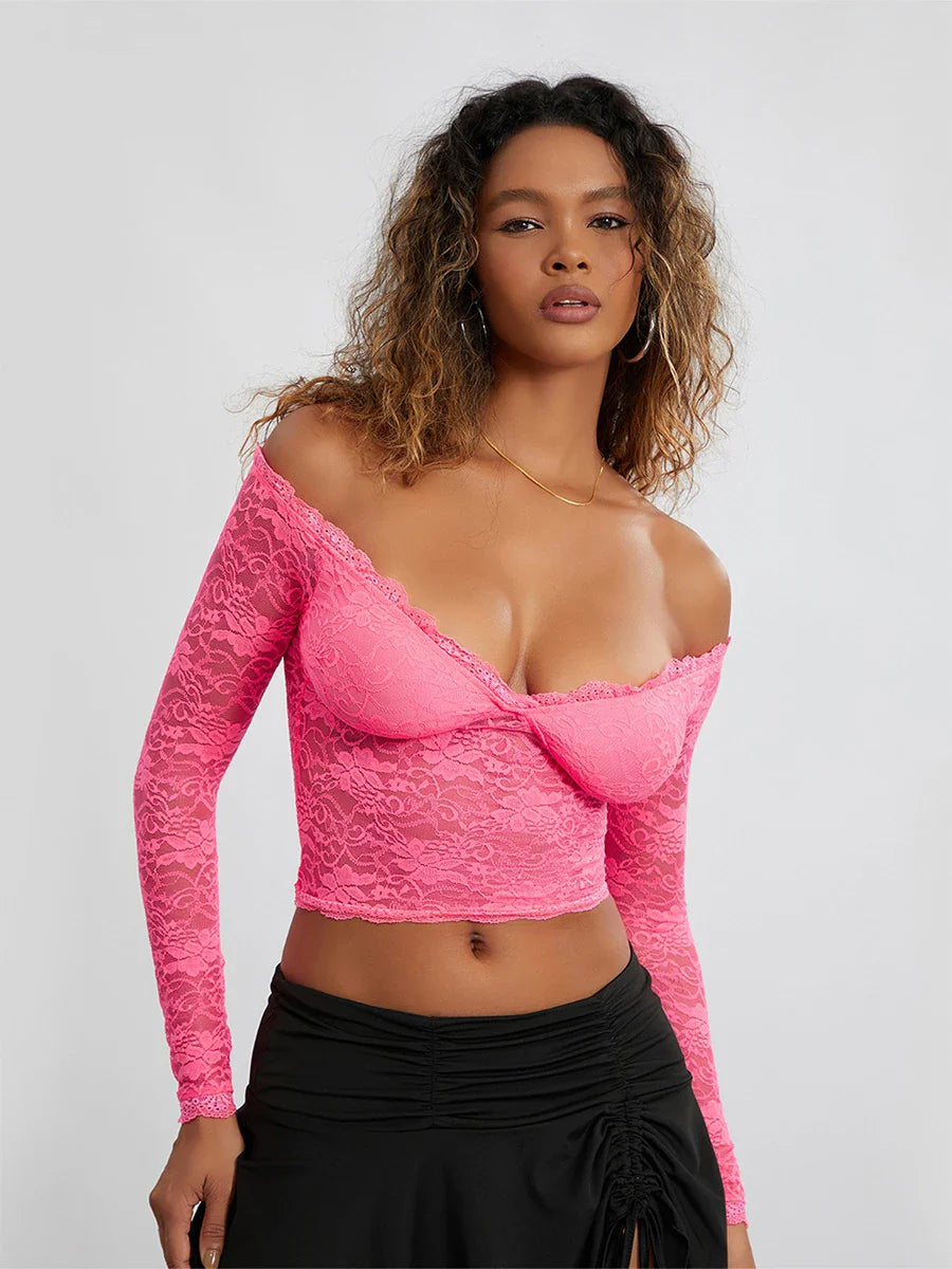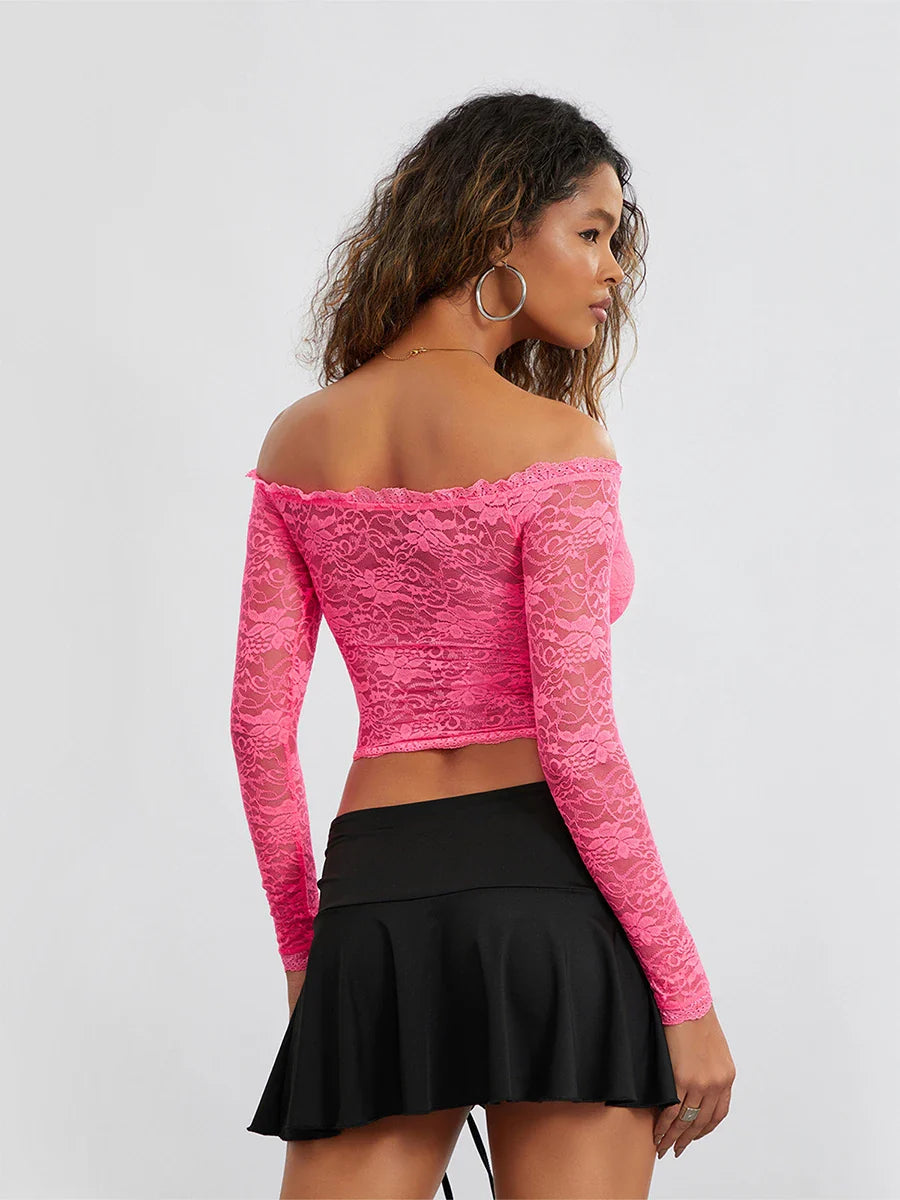Znbbw Women's Off Shoulder Lace Sheer Crop Tops Spring Fall See-Through Long Sleeve Low Cut Slim Fit Short T-Shirts Basic Tees