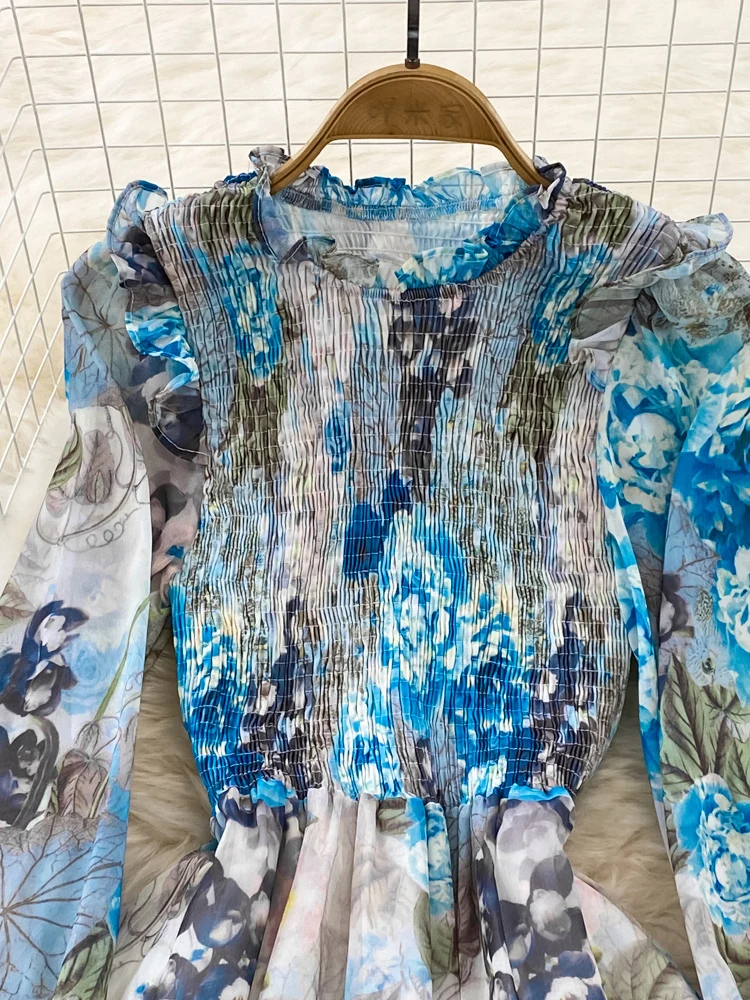 Znbbw Women's Spring Autumn Long Sleeved Chiffon Dress with Wooden Ear Edge Waist Closing Floral Holiday Big Hem Long Dress D2460