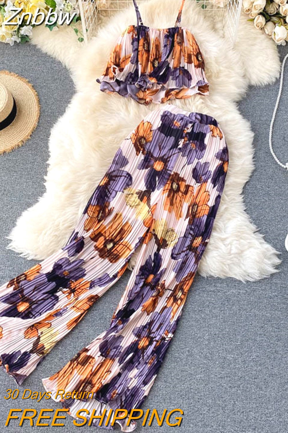 Znbbw Women's Summer Sets Vacation Style Printed Short Camisole Pleated High-waist Wide-leg Pants Two-piece New Casual Sets LL956