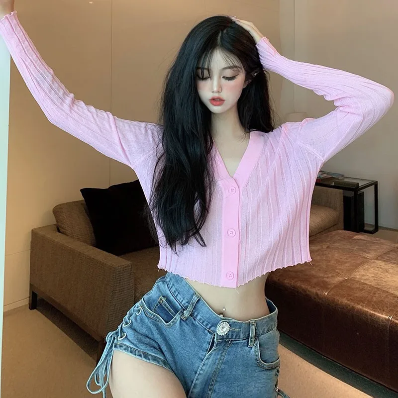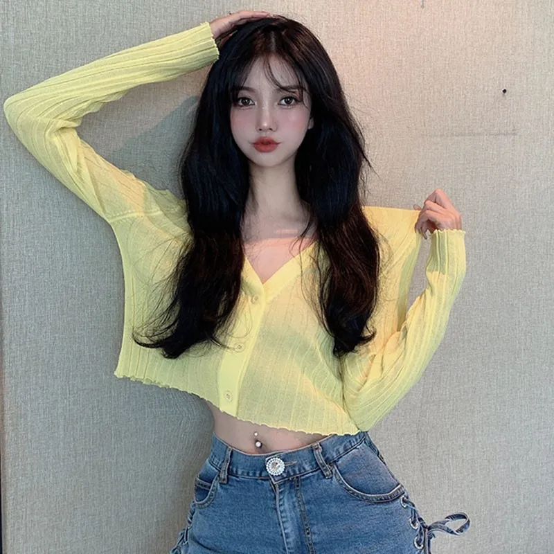 Znbbw Women's V-neck Thin Top Sunscreen Button Knitted Cardigan Short Slim Fitting Long Sleeved Cardigan