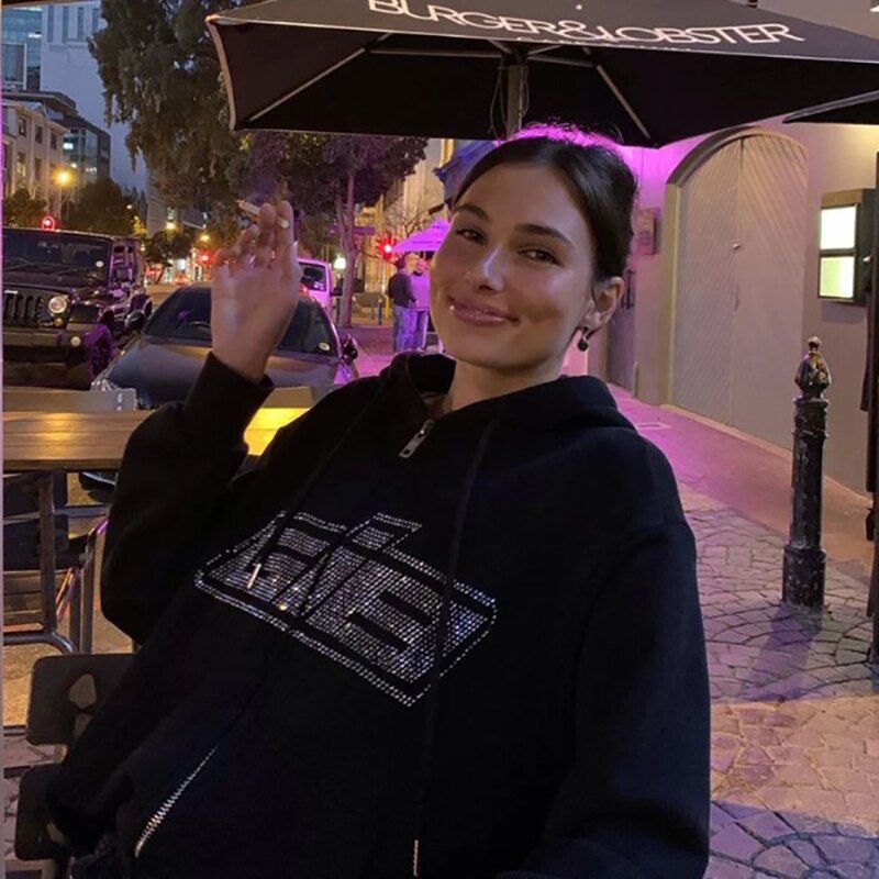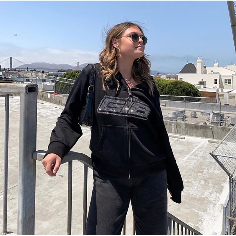 Znbbw Y2K Fashion Zipper Oversized Hoodies E-girls Vintage Solid Letter Long Sleeve Black Sweatshirts Autumn Outfits