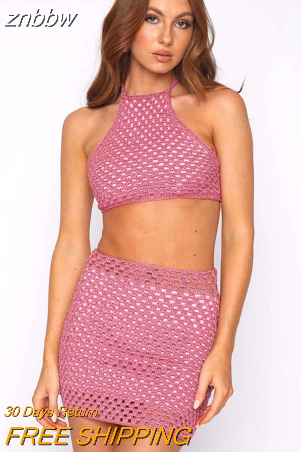 znbbw Y2K Hollow Out Knit Skirt Sets Women Solid Sleeveless Halter Tie Up Crop Tops+Mini Skirts Female Summer Sexy Two Piece Sets