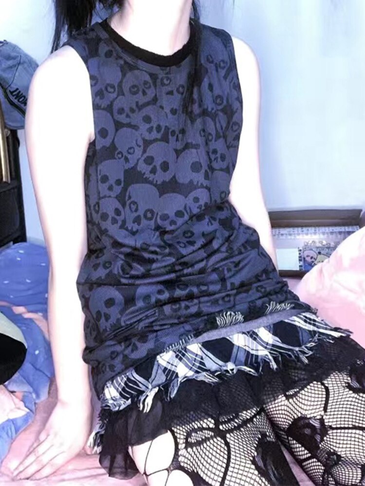 Znbbw Y2k Skull Print Street Top T Shirt Emo 90s Summer Dark Retro Slim Korean Women's Sports Top Skull Print Tank Top Vintage
