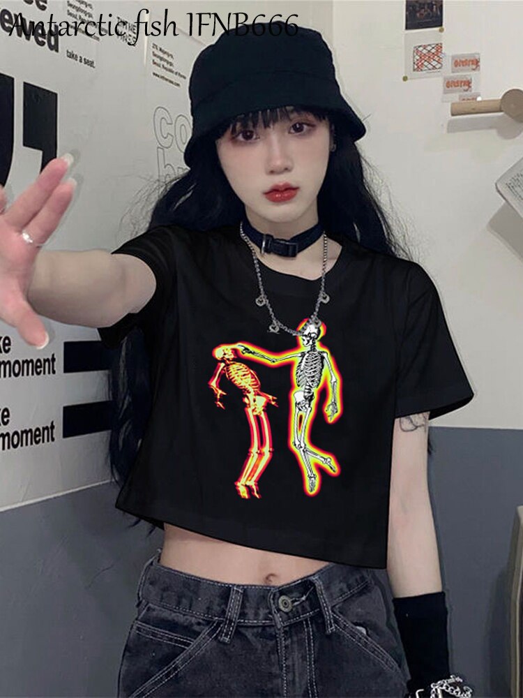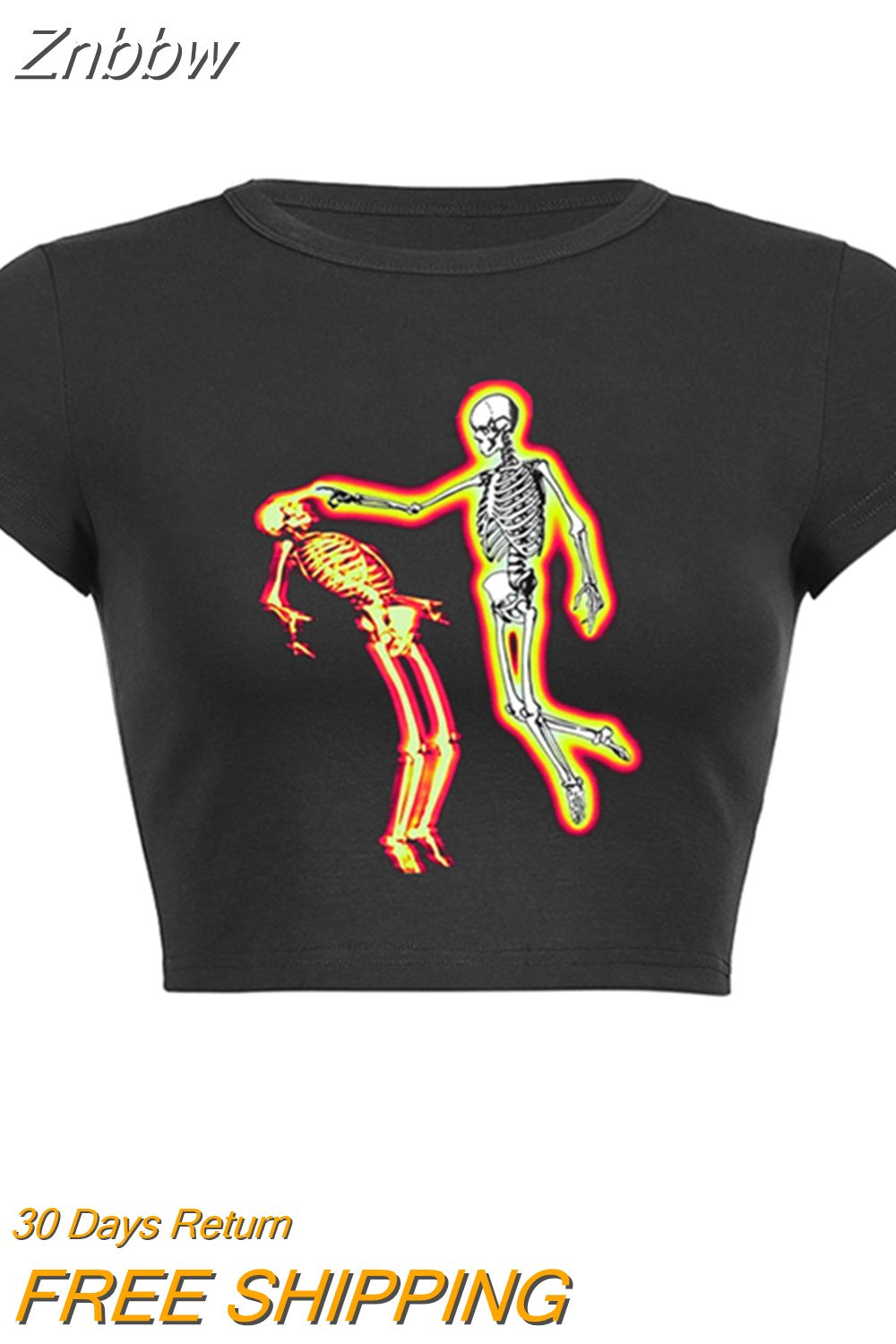 Znbbw Y2k tops skull print top Korean O-neck crop top 90s summer fashion punk casual aesthetic T-shirt vintage aesthetic top