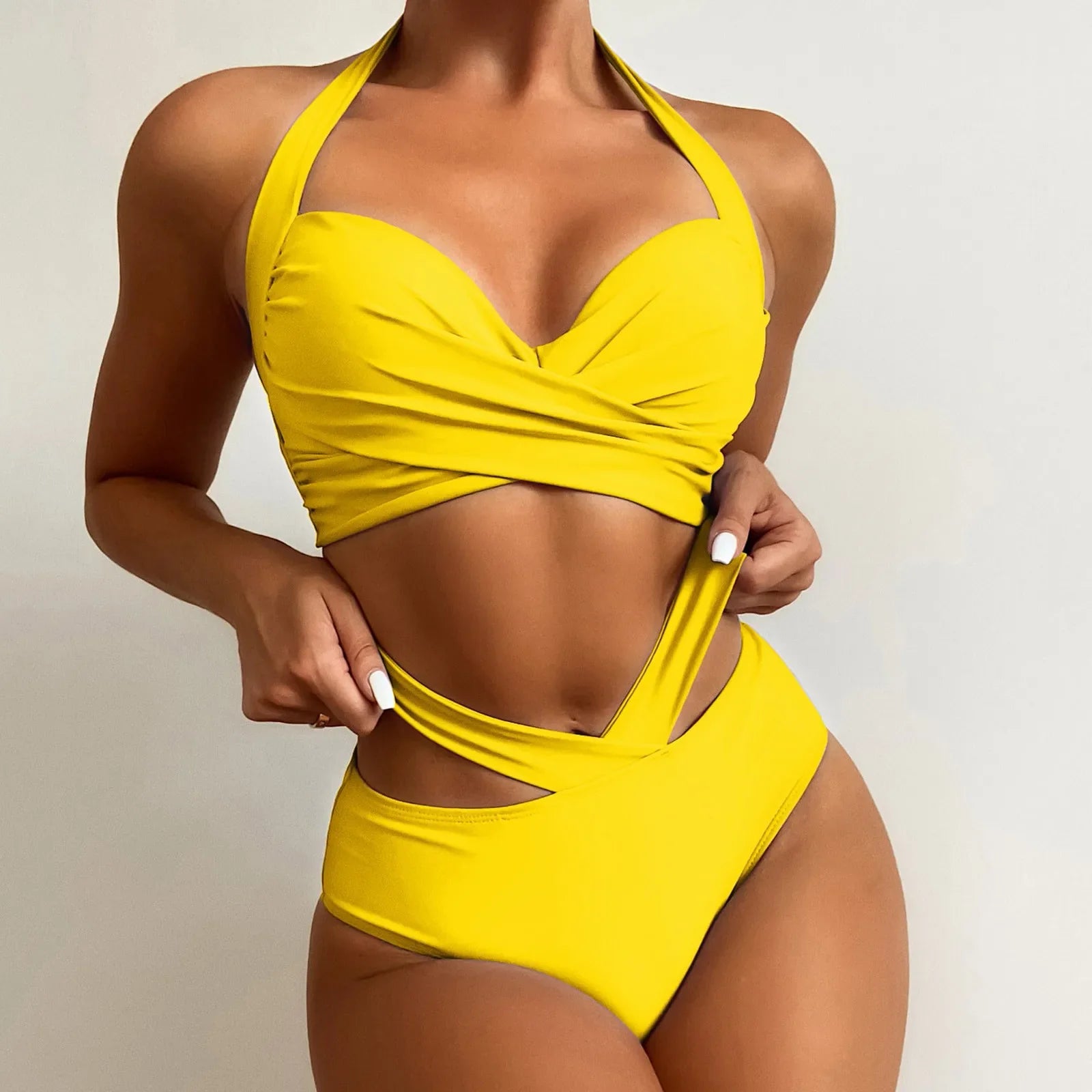Znbbw Yellow Ruched Women's Swimsuit Summer Elegant Push Up Bra High Waist Swiming Suits Ladies Hollow Out Bandage Swimwear